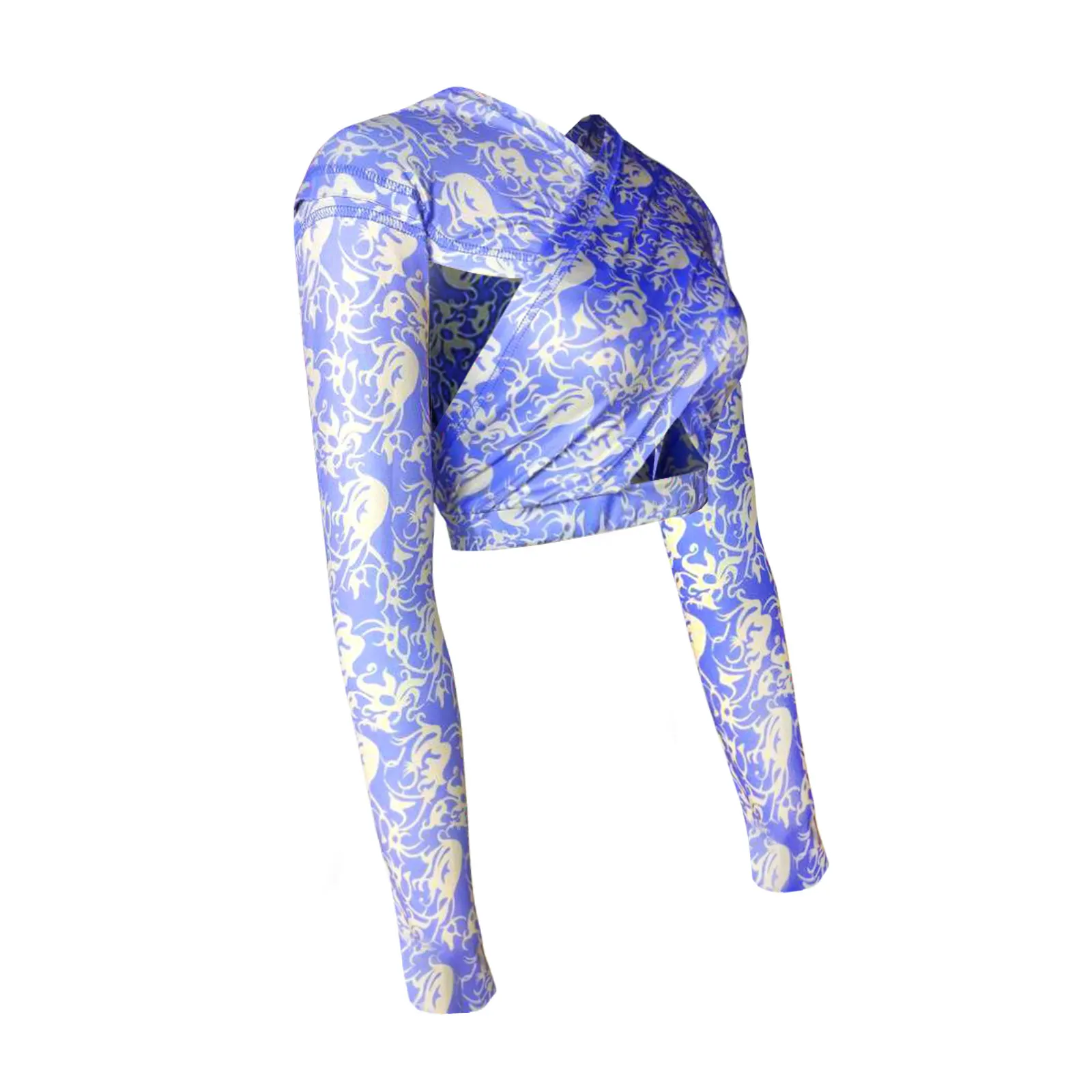 Женский летний укороченный топ с цветочным принтом, открытая блуза с перекрестным воротником и длинными рукавами