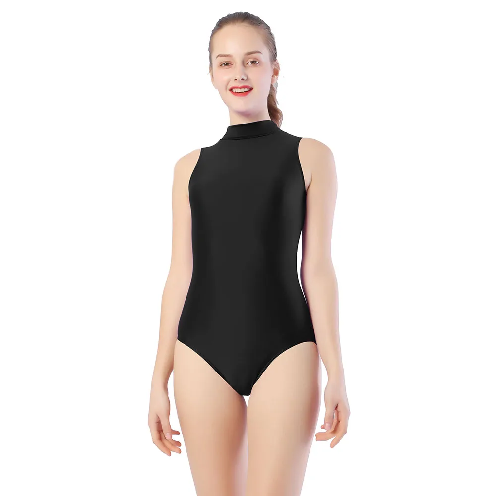 AOYLISEY Для женщин без рукавов купальник для балета, танцев с открытой спиной для женщин Гимнастика черный с высоким воротом комбинезон костюм кожи