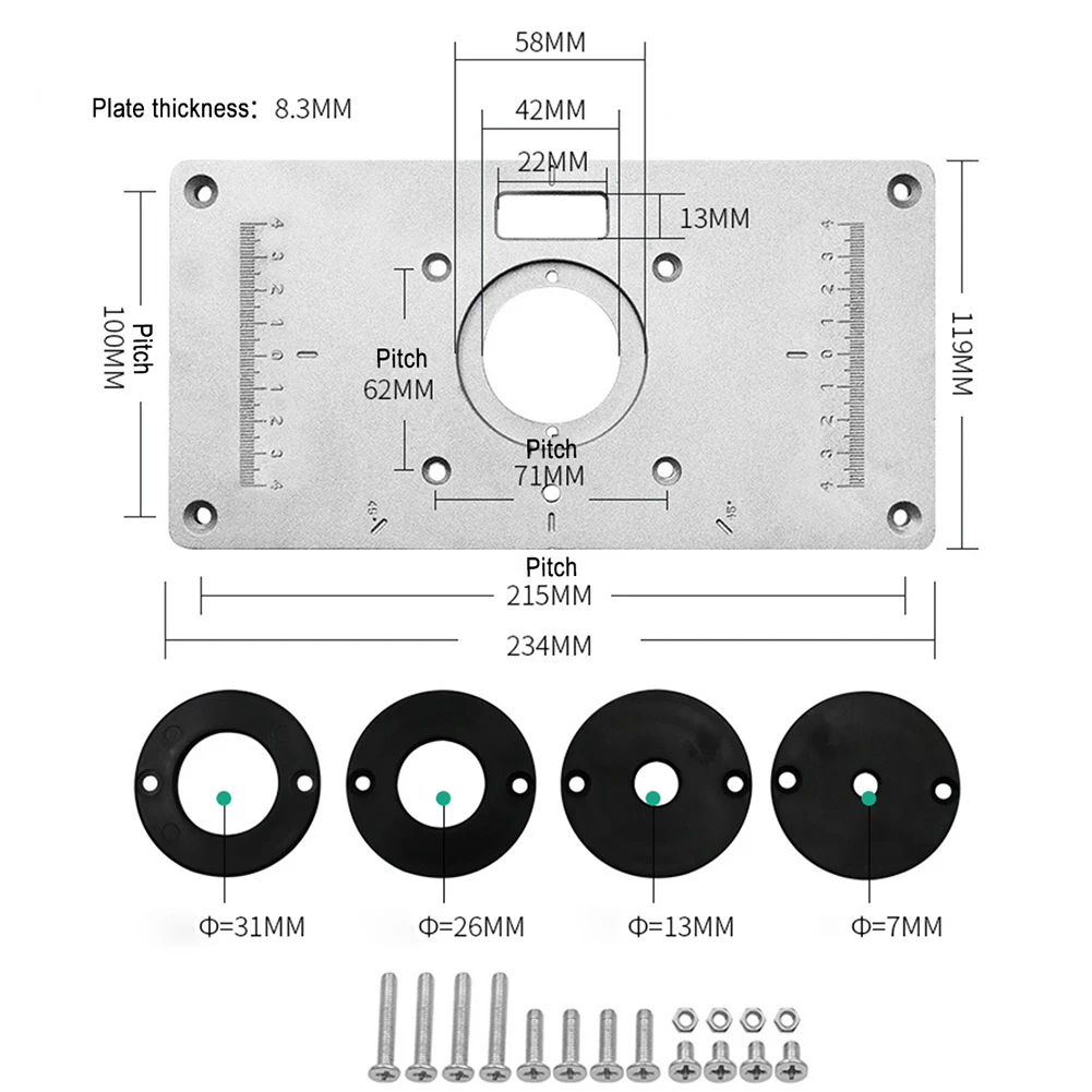 Алюминиевая вставная пластина для фрезерного стола с 4 кольцами, винты для деревообрабатывающих станков, ручной инструмент, Прямая доставка