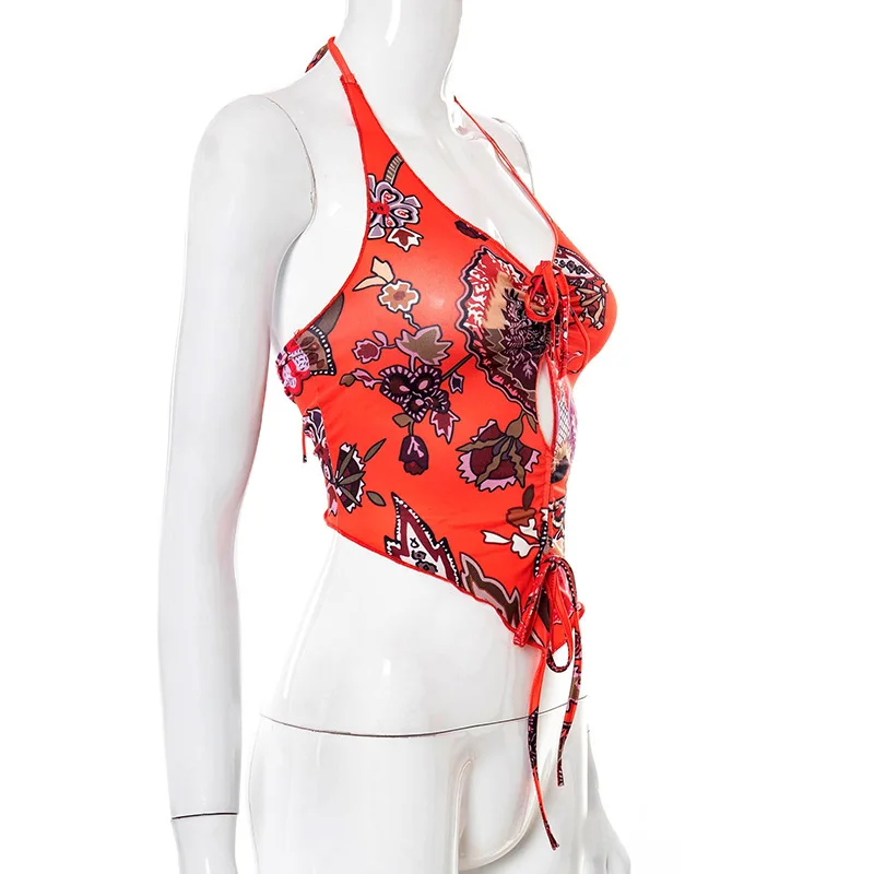Женский короткий топ с рюшами и лямкой на шее, с открытой спиной