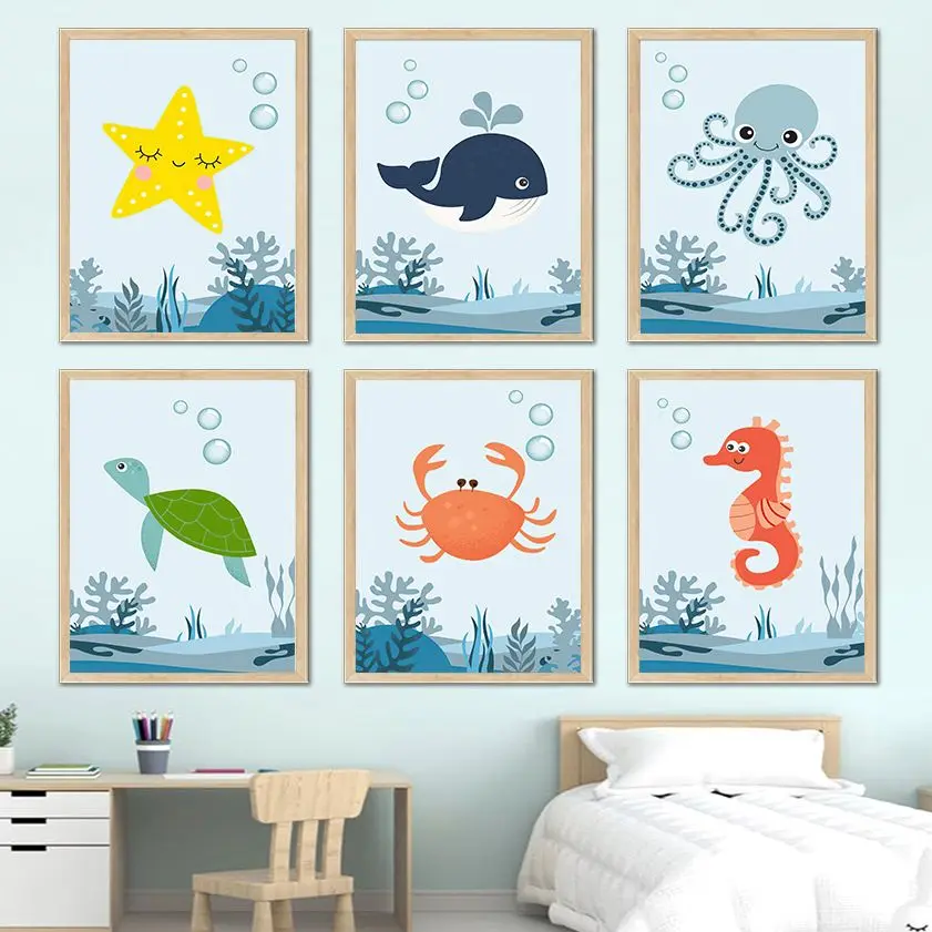 Морская звезда, Кит, осьминог, черепаха, детский КИТ, настенная живопись на холсте, скандинавские плакаты и принты, настенные картины для детской комнаты, ДекорМатериал: экологически чистый хлопокХарактеристика: солнцезащитный, водонепроницаемый, никогда не выцветает