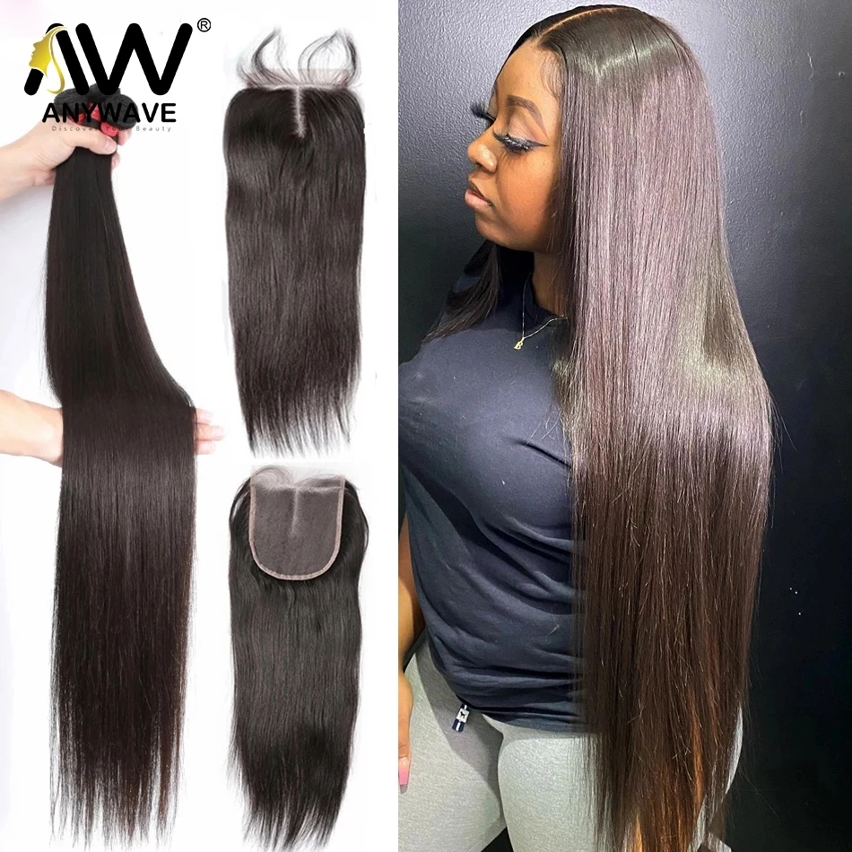 Прямые бразильские волосы для наращивания, прямые, 3, 4 пучка, с сетчатой основой 4x4, 100%, 28, 30, 32 дюйма