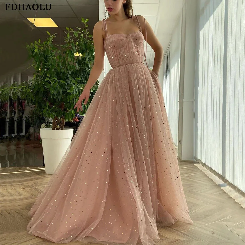 Платье для выпускного вечера LUXIYIAO LO176, розовое Тюлевое Плиссированное длинное платье-трапеция на бретелях с карманами, свадебные вечерние платья