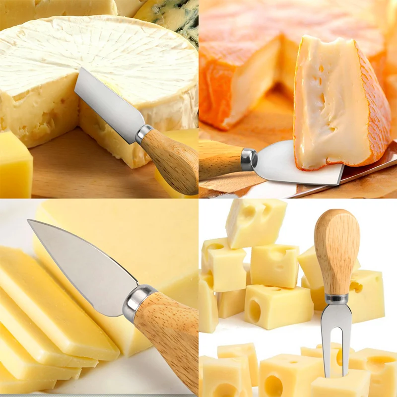Набор из 4 ножей для сыра-мини-нож, нож для масла, лопатка и вилка-Эти ножи для сыра, изготовленные из профессиональной нержавеющей стали и деревянной ручки, станут идеальным аксессуаром для любителей сыра в вашей жизни! Этот набор ножей для сыра может держать, резать, зажимать, бриться, нарезать, распространять и обслуживать все ваши любимые сыры-Каждый нож для сыра хорош для твердых, мягких, крошечных и вилочных сыров; Светильник кие, но Твердые ножи очень красивые, чтобы показать в качестве сервировочных ножей на вечеринке-отлично подходит в качестве подарка на свадьбу, новобрачные, девичник, новоселье, дни рождения, Рождество и праздники-Прочная и эргономичная конструкция ножей из нержавеющей стали Обеспечивает сбалансированную и уверенную кромку для нарезки, нарезки, распространения и подачи мягких и твердых сыров.
