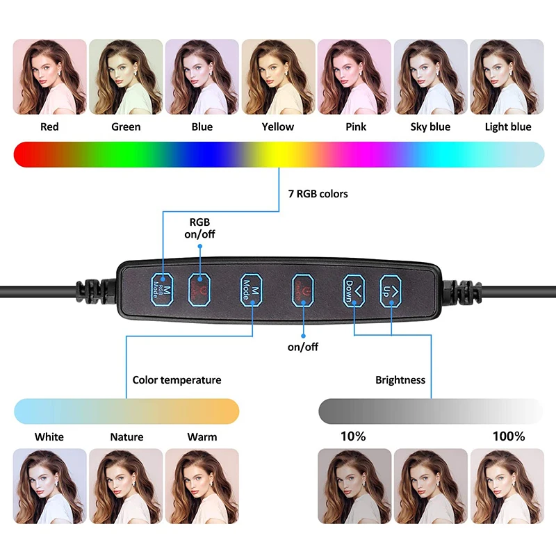 2).15 цветов RGB, 15 динамических режимов и белый светильник, теплый светильник, мягкий светильник.