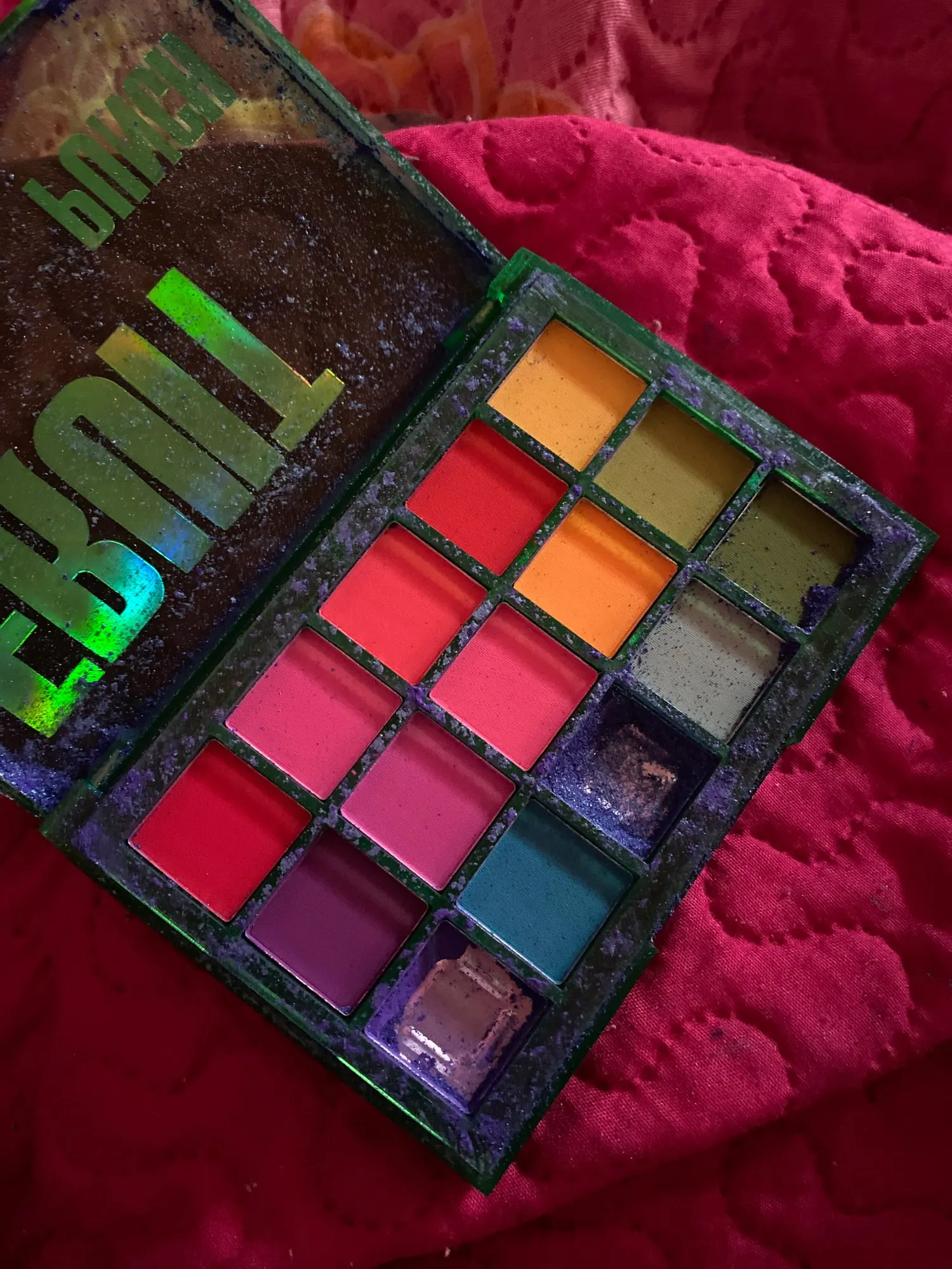 вся пупырка в разбитых тенях. разбитых фиолетовый цвет половина и полностью единственный блестящий цвет. из-за этого вся палетка в блестках. кусок палатки откололся, либо пока шла почтой, либо изначальный дефект, но из-за этого упаковка не только внутри вся в разбитых тенях, но и снаружи