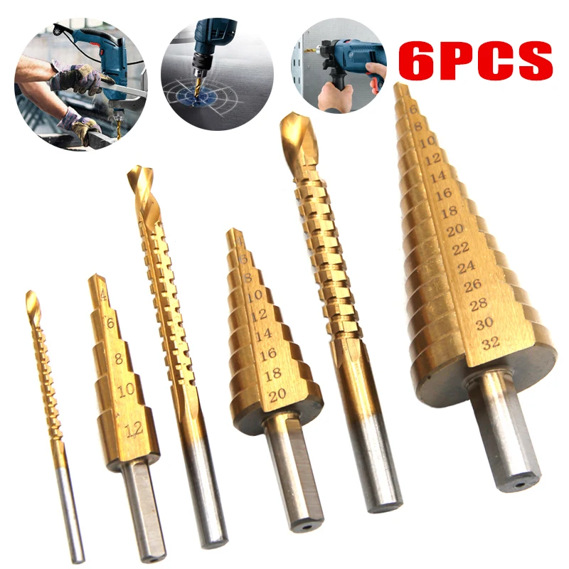 Набор ступенчатых сверл, комплект из 6 насадок из быстрорежущей стали, 4-12 мм4-20 мм4-32 мм, для резки металла и конических конусов