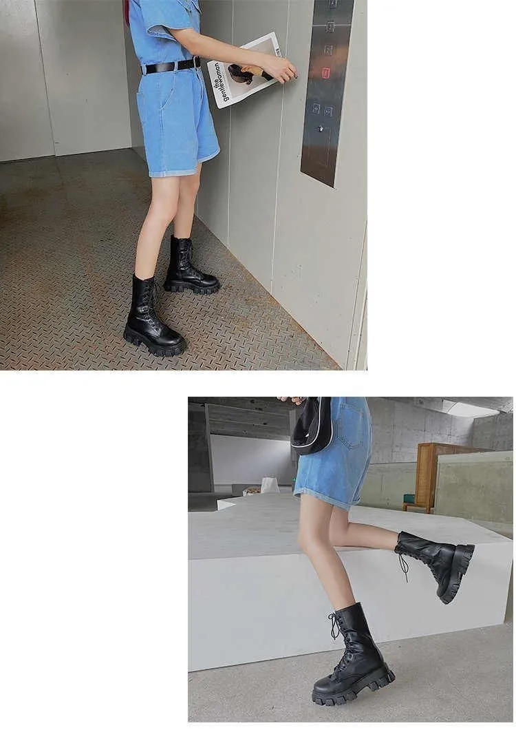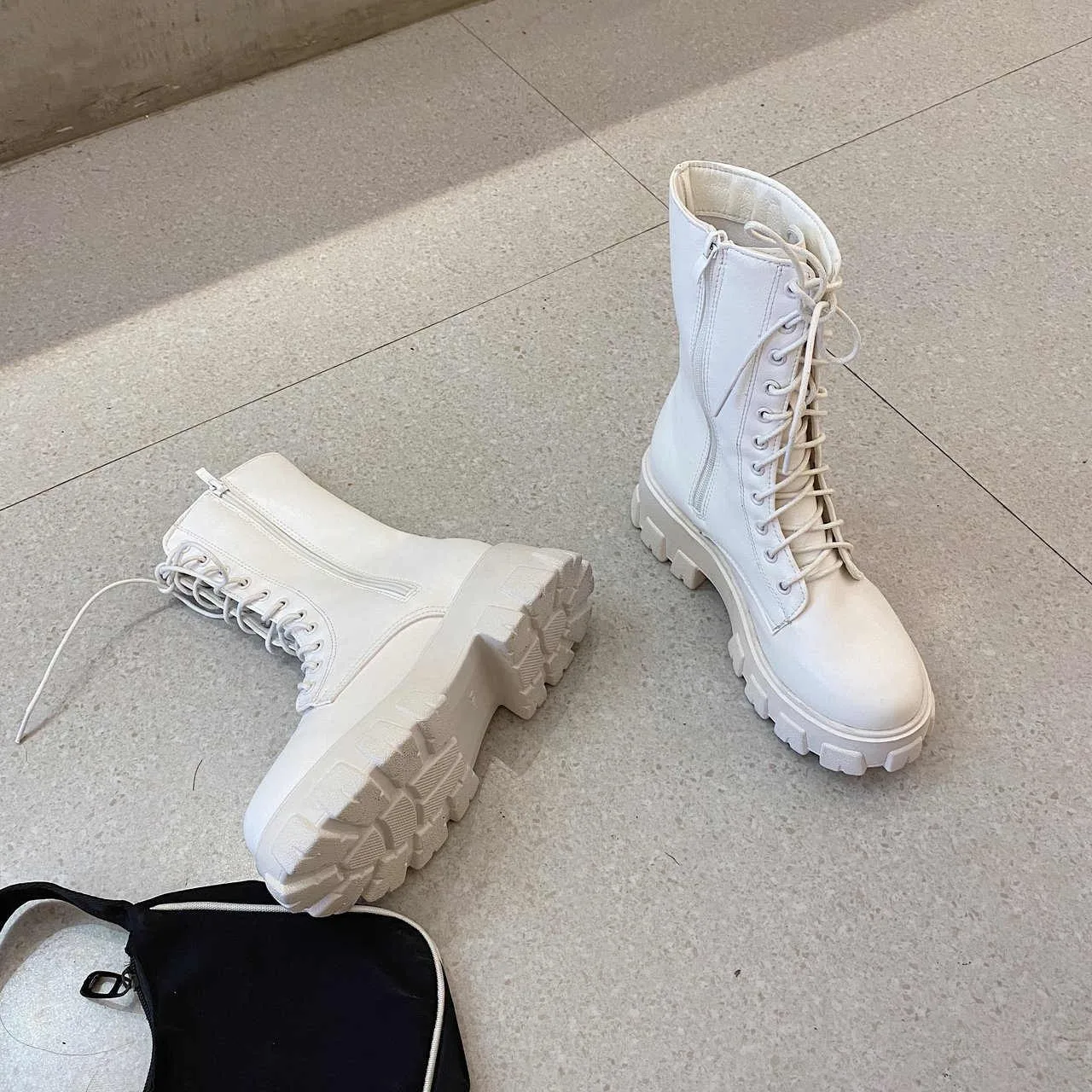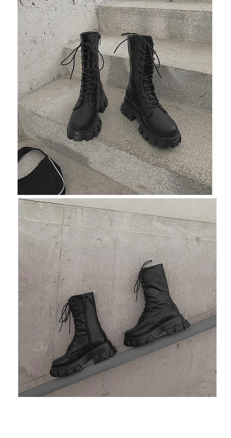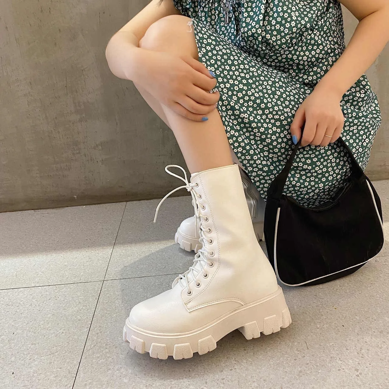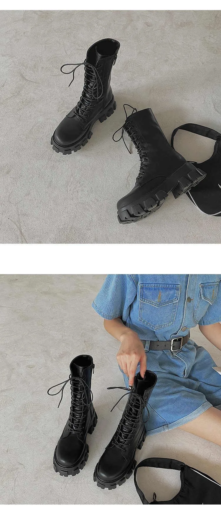 Женские сапоги на шнуровке, водонепроницаемые сапоги из натуральной кожи на высоком каблуке, с круглым носком, на платформе, в Корейском стиле