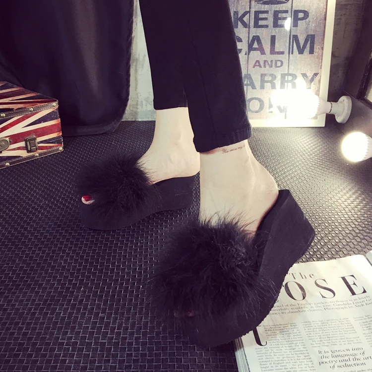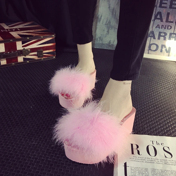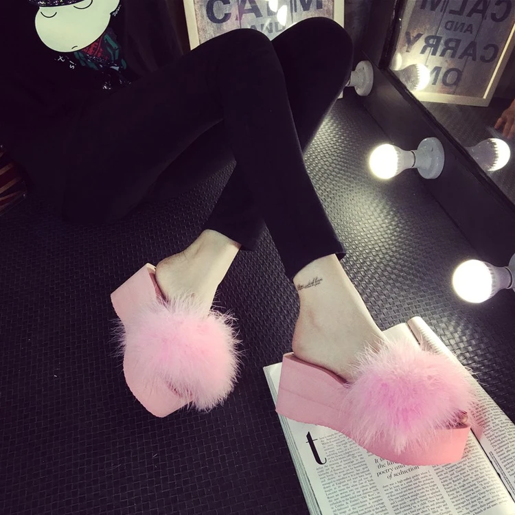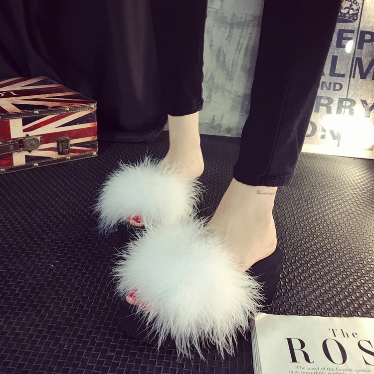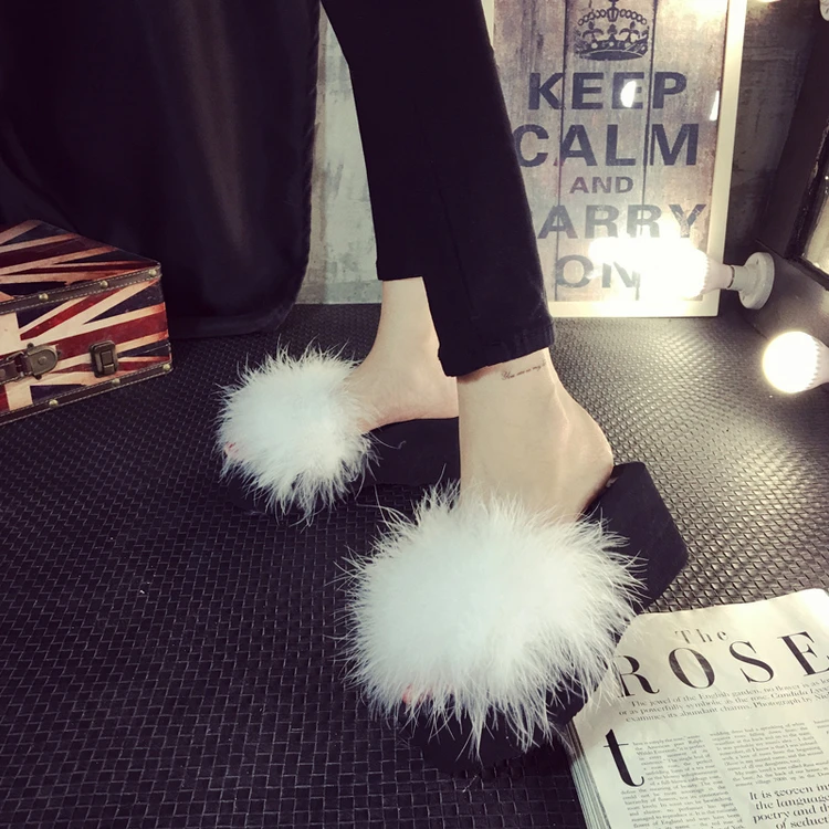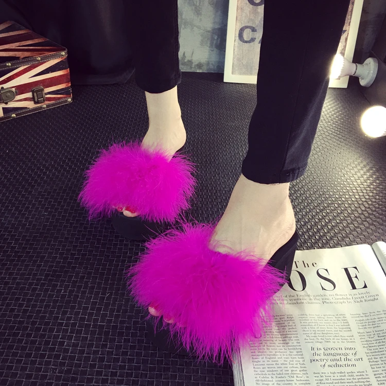 Шлепанцы женские домашние, меховые сандалии на танкетке 5 см, страусиные перья, пляжная обувь, Повседневные тапочки на платформе