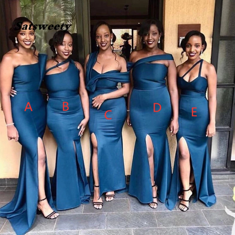 Платье женское атласное с разрезом спереди, пикантное длинное вечернее, с юбкой-годе, без бретелек, для подружки невесты, темно-синее