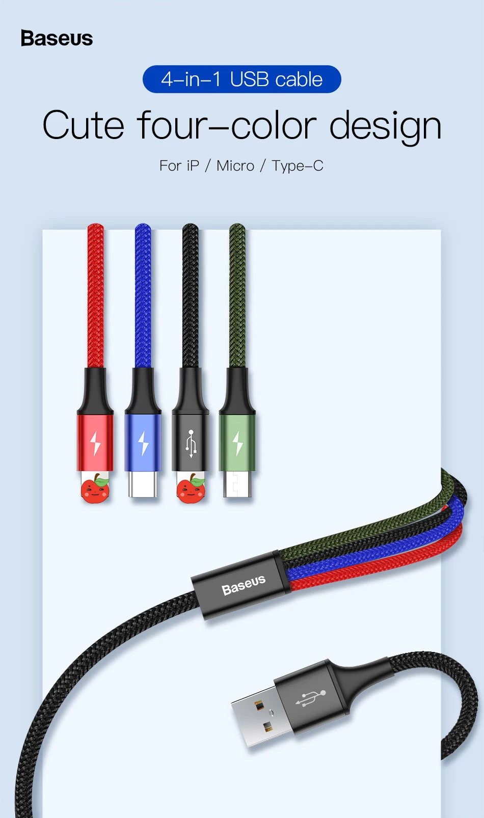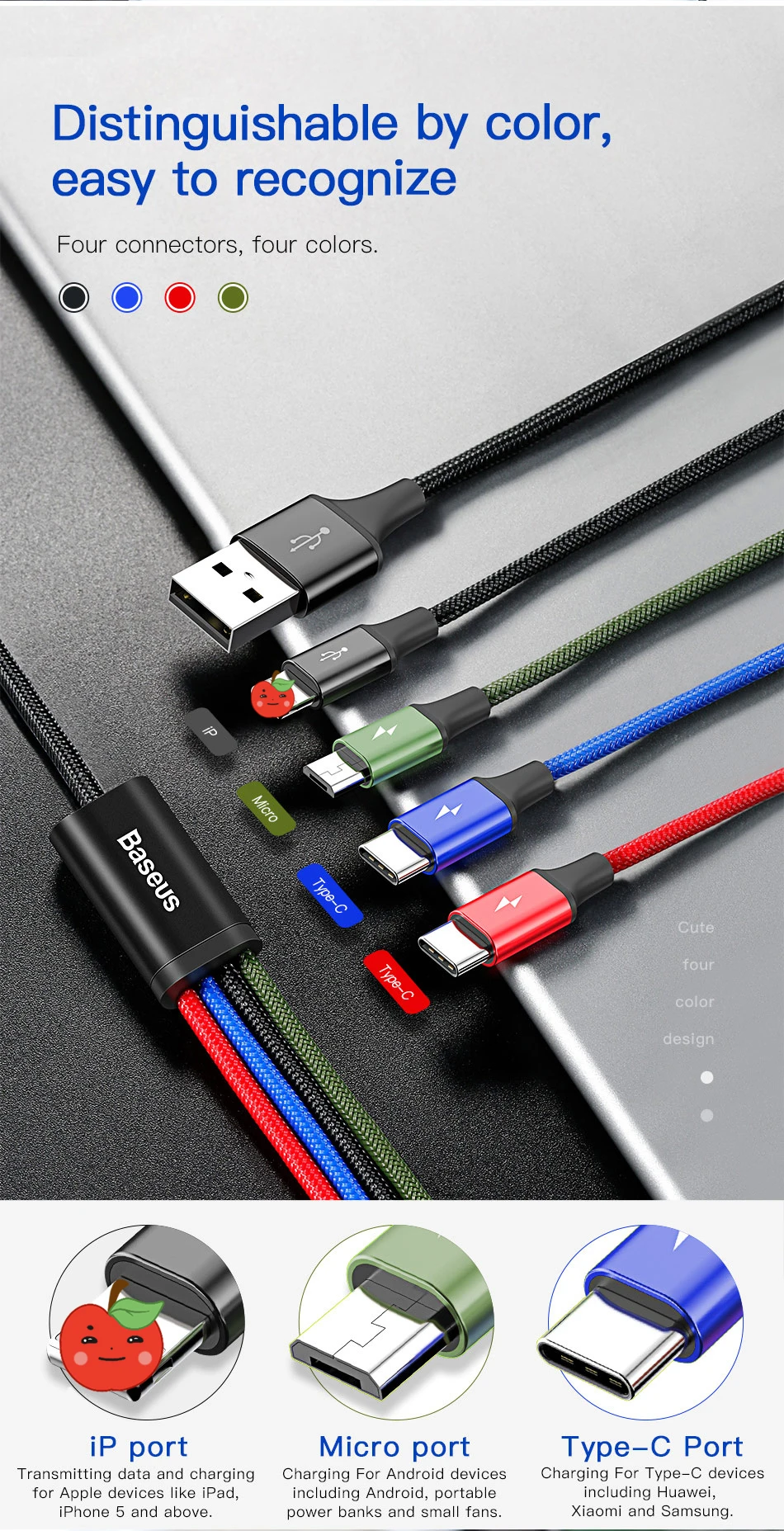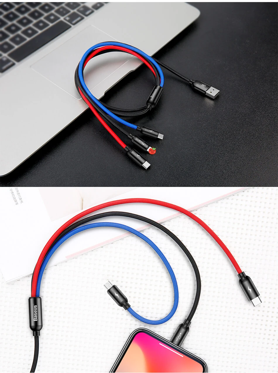 Baseus 3 в 1 USB кабель для iPhone 12 11 Pro Xr Xs Max Быстрая зарядка 4 в 1 кабель Type C Type-c кабель Micro USB для Мобильный телефон