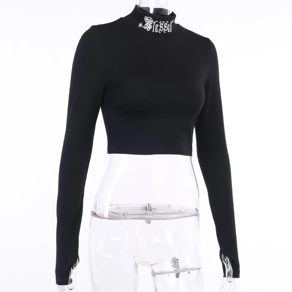 Женский короткий топ с длинным рукавом, черный однотонный топ с вышивкой букв, готика, Харадзюку
