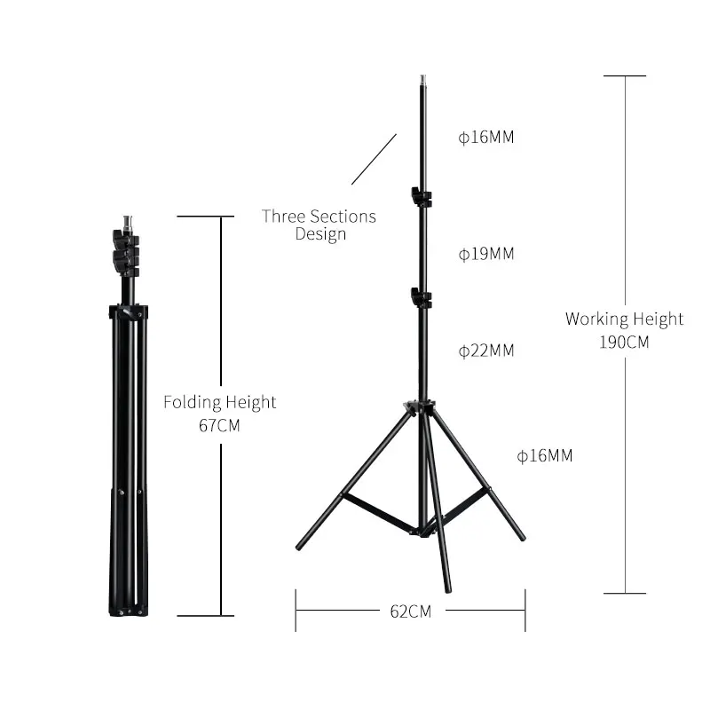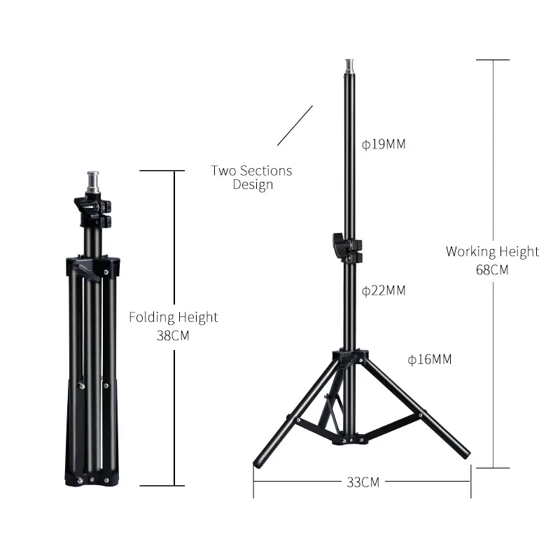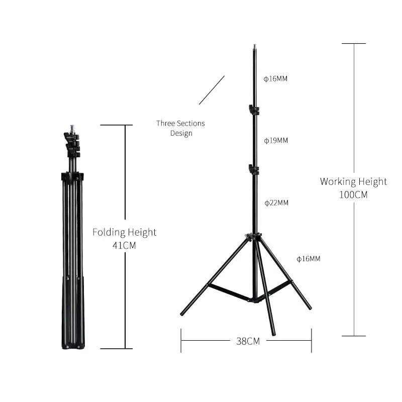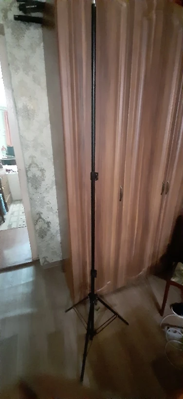 отличный высокий штатив. учтите что сверху нет шпильки для крепления. пришлось самом просверлить, нарезать резьбу и выкрутить шпильку для крепления камеры и светильников