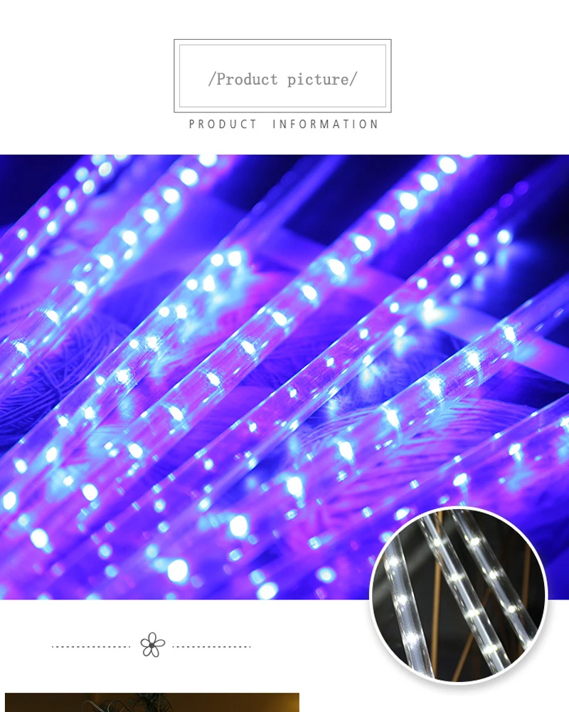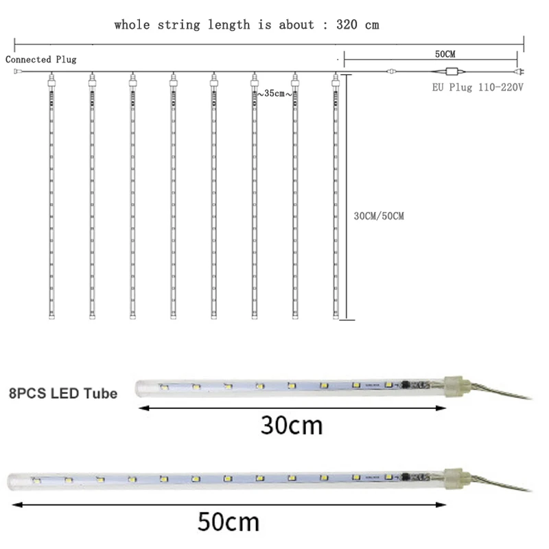 Описание Светодиодный светильник для трубки: 30-24 светодиодный s; 50-36 светодиодный sКоличество труб: 8 трубокКол-во светодиодный ламп: 192/288 светодиодный светДлина трубки: 30 см/50 смДиаметр трубки: 1 смТип вилки: штепсельная вилка европейского стандарта/штепсельная вилка американского стандартаОбщая длина: около 320 смРабочее напряжение: 85-265 В переменного токаШтепсельная Вилка: с разъемом, Поддержка множества струн, соединяемых вместеПримечание: Для использования на улице, пожалуйста, тщательно Защитите вилку и контроллер, чтобы избежать случайного повреждения. Рекомендуется не использовать его в плохую погоду (снег, град, дождь, сильный ветер и т. д.) что уменьшит срок службы продукта. ОсобенностиЭффект метеоритного дождя, романтическая эстетикаСветильник каждой лампы включается и выключается один за другим последовательно и быстро, как метеоритный дождь или падающий снег в ночном небеПрименение: рыночное инженерное освещение, архитектурное украшение, украшение деревьев вдоль улиц, парки, украшения, декоративные реки, городское ночное освещениеВодонепроницаемый, пыленепроницаемый, устойчивый к коррозииНизкое энергопотребление, энергосбережение