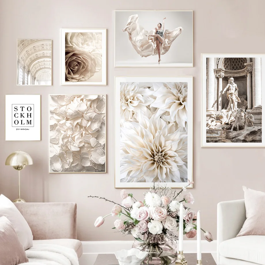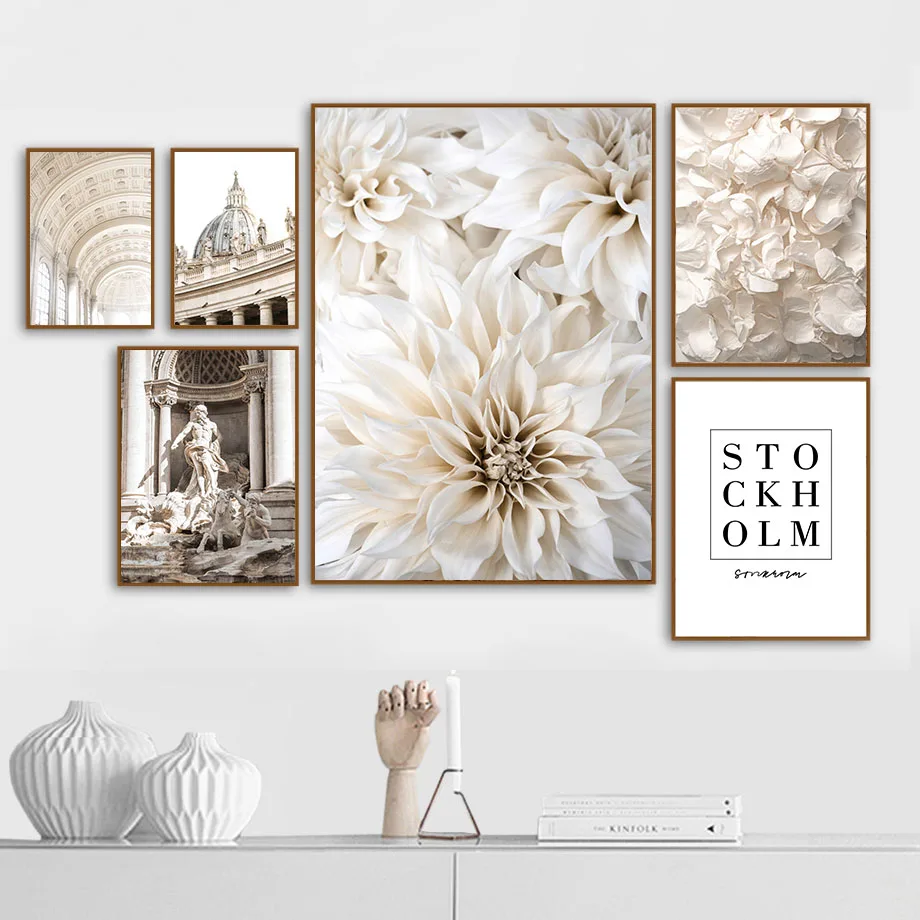 Картина на холсте с белыми цветами, церковью, фонтаном Треви, постеры и принты в скандинавском стиле для декора гостиной