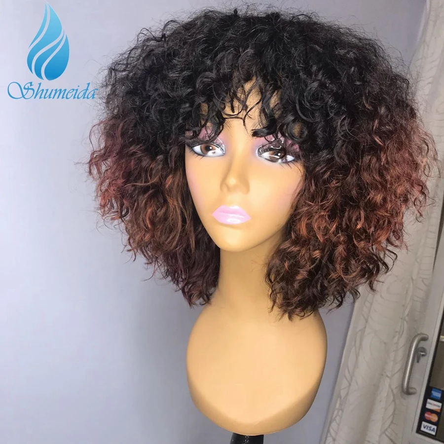 Парики Shumeida из каштановых натуральных волос с эффектом деграде для женщин, плотность 180%, кудрявые бразильские волосы без повреждений, полностью машинные парики с челкой