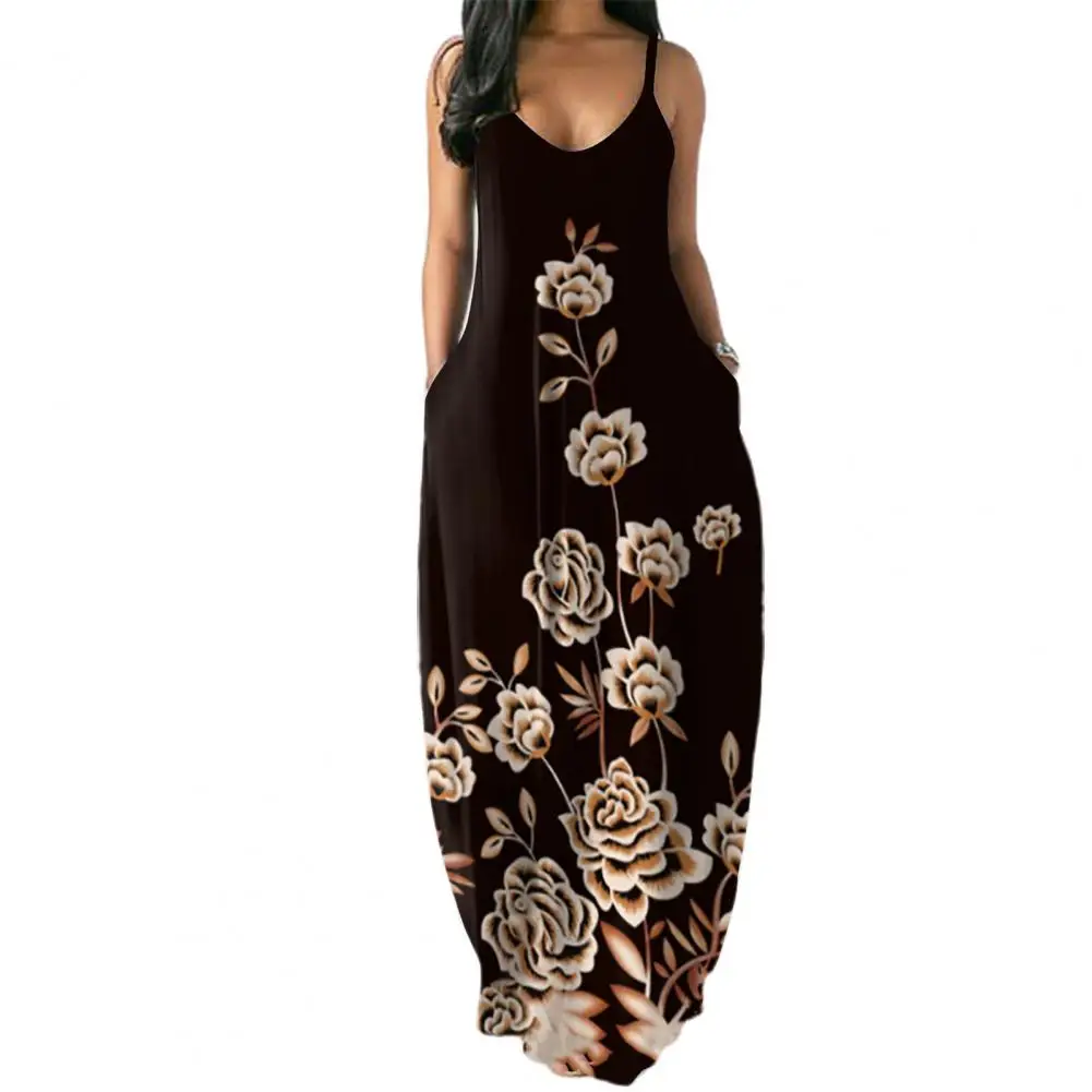 Платье-комбинация с цветочным принтом на бретельках; Летнее Длинное Платье-комбинация с карманами для путешествий