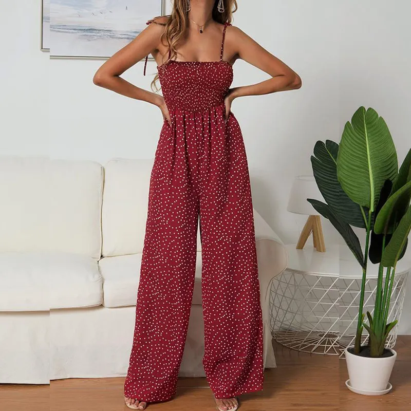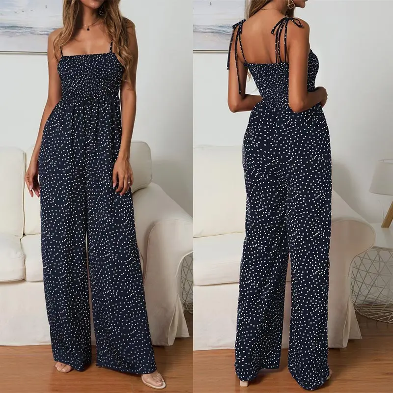 Женский комбинезон в горошек, темно-синий комбинезон в стиле бохо на бретелях-спагетти с высокой талией и широкими штанинами, лето 2021