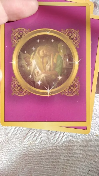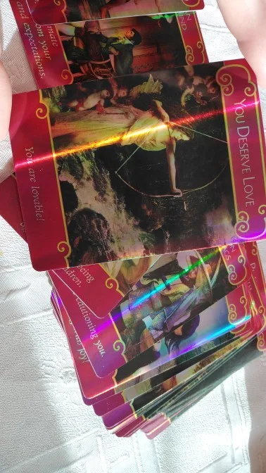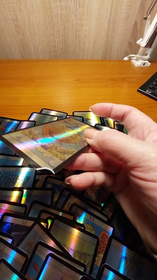 карты очень хорошие, с золоченым тиснением на лицевой стороне. Маленькие, как обычные игральные карты, удобно помещаются в руке...но не ламинированные...карта Колесо фортуны в колоде оказалась с заломленым уголком, думаю не критично. большой минус- долгая доставка((( перезаказать пришлось на Вайлберис...товаром довольна