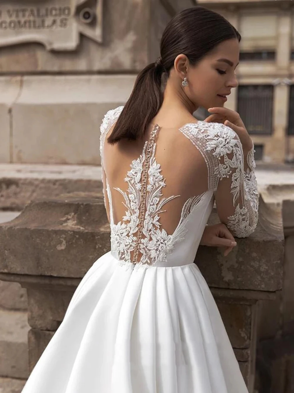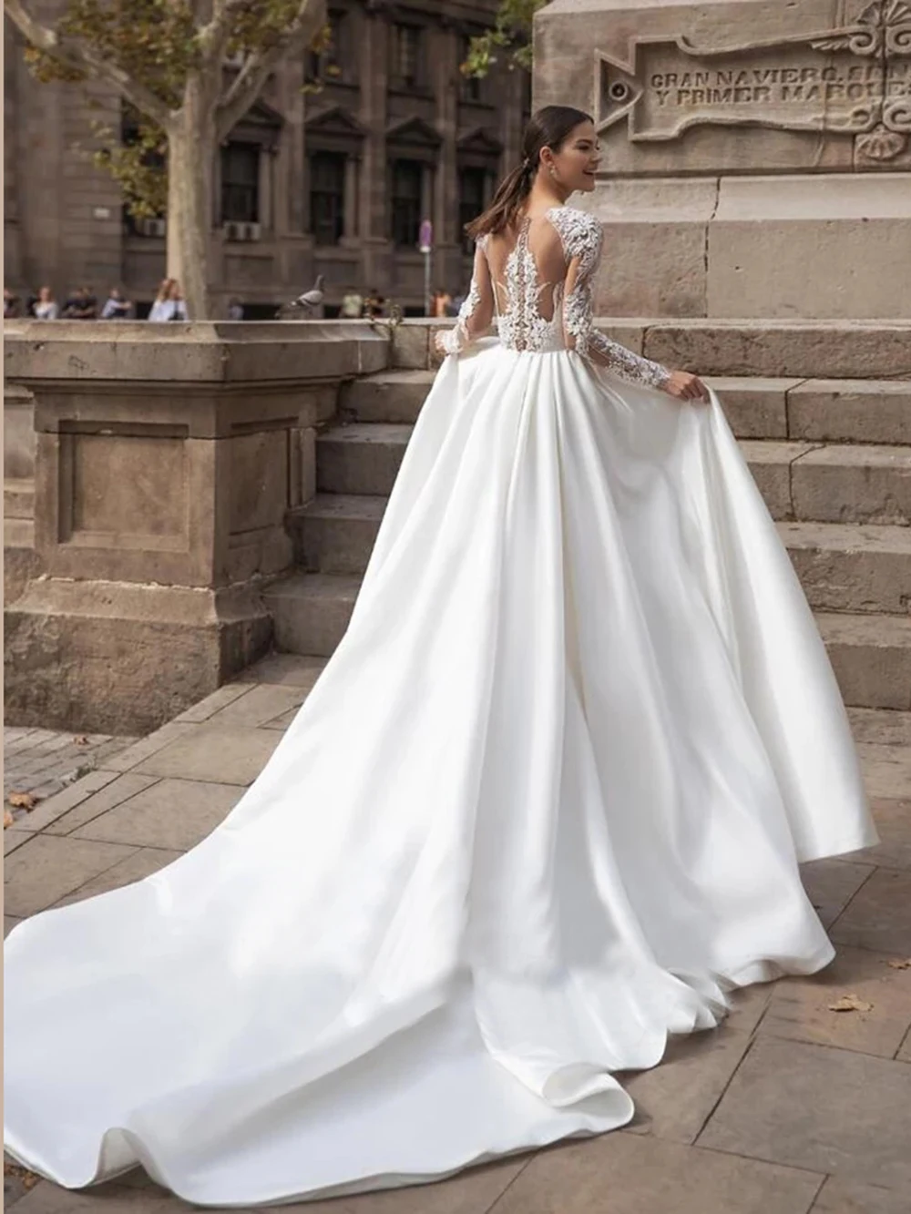 Женское атласное свадебное платье WUZHIYI, ТРАПЕЦИЕВИДНОЕ ПЛАТЬЕ с карманами, длинными рукавами, кружевной аппликацией и бисером, 2021