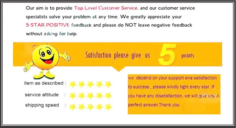 Ваше удовлетворение и положительные отзывы очень важны для нас. Пожалуйста, оставьте положительные отзывы и 5 звезд. Если вы удовлетворены нашими товарами и услугами. Пожалуйста, не оставляйте нам 1,2,3,4 звезд, потому что они равны отрицательным отзывы. Если вы остались недовольны качеством товара и обслуживания, не торопитесь подтверждать получение товара и писать негативный отзыв. Сначала свяжитесь с нами. Мы сделаем все возможное, чтобы решить любые проблемы и предоставить Вам лучшее обслуживание клиентов.