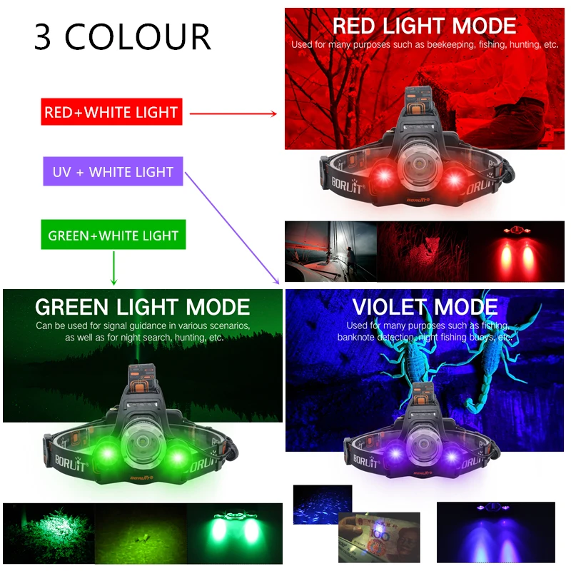 2000LM 3LED налобный фонарь красныйзеленыйUVбелый светильник на открытом воздухе головной светильник 3 режима Водонепроницаемый USB флэш-Фара Фонарь Фонари для охоты