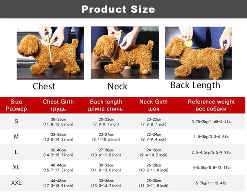 1. Сначала измерьте грудь вашего питомца, длину спины и окружность шеи, а затем выберите подходящий размер в соответствии с таблицей размеров изделия.2. Во-вторых, размер одежды, которую вы выберете, должен быть на 2-3 см больше, чем размер вашей собаки.3.Для двух ног, пожалуйста, обратите внимание на обхват груди, и для четырех ног, должны соответствовать обхвату груди и длине спины.4. Для растущего питомца вам лучше выбрать больший размер.5. Если размер между 2 размерами, пожалуйста, выберите большой размер.