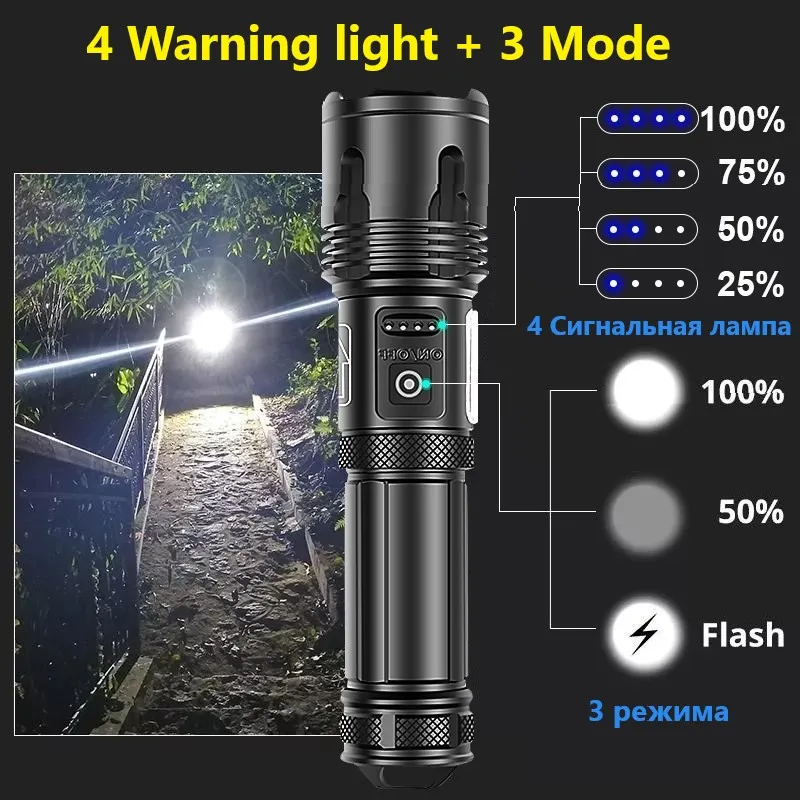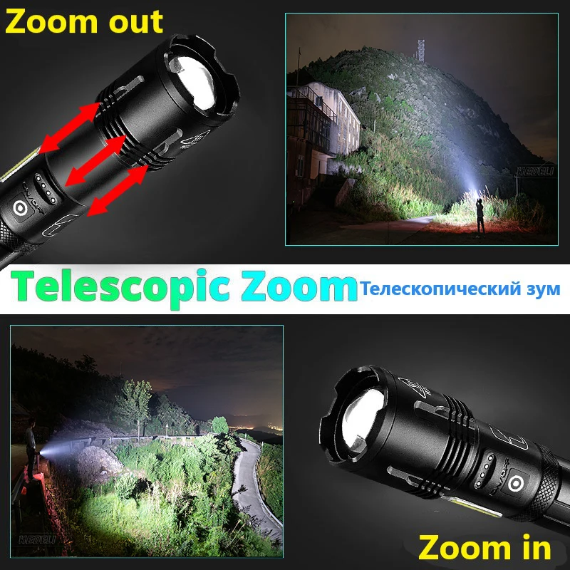 ♦Бренд: HEDELI♦Светодиодный светильник Модель: XHP160 + COB(Новое обновление 9 ядер)♦Лампа/светодиодный срок службы: более 100000 часов♦Диапазон: 800-1200 метров♦Режим масштабирования: телескопический зум♦Тип источника питания: 1*18650 или 1*26650 (аккумулятор заряжается; Не подключайте положительные и отрицательные полюсы Аккумулятора Обратно; Не смешивайте аккумуляторы)♦Время освещения: 8 часов (26650)♦Функция внешнего аккумулятора: Да (можно заряжать телефон)♦Дисплей питания: 100%-75%-50%-25%♦Режим переключения: 3 режима XHPXHP160 светодиодный (высокий-низкий-SOS) + 4 режима COB (белый светильник 100%-белый светильник 50% красный светильник 100%-красный светильник SOS)