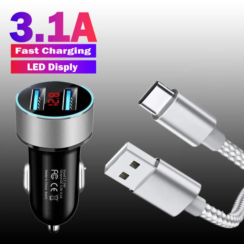 Автомобильное зарядное устройство с двумя USB-портами и светодиодным дисплеем, 3,1 А, быстрая зарядка для Xiaomi 11 Lite, Huawei Mate 20, 30, Samsung A51, A71, нейлоновый плетеный кабель для передачи данных