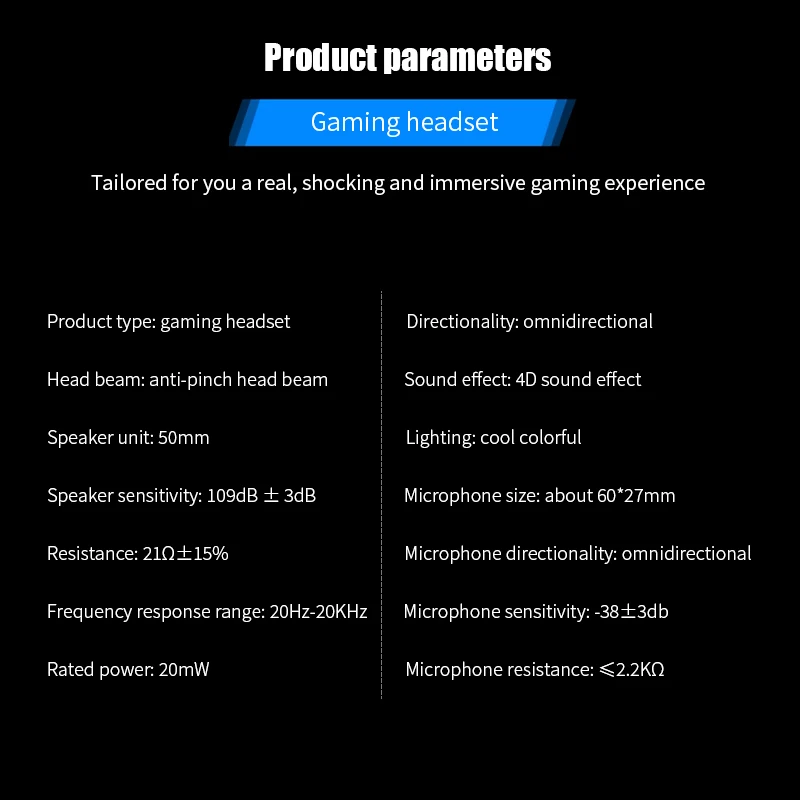 Тип товара: игровая гарнитура Направленность микрофона: всенаправленный P Модель roduct: G60 Материал ушей: белковый хлопок L Ights: прохладные красочные огни Динамик: 50 мм Чувствительность: 105 дБ ± 3 дБ Частотная характеристика: 20 Гц-20 кГц Длина провода: 2 м Сопротивление: 32 Ом Сердечник провода: вся медная эмалевая проволока Разъем: 7,1 USB/3,5 мм Вес: 500 г Посылка включает в себя: 1 игровая гарнитура