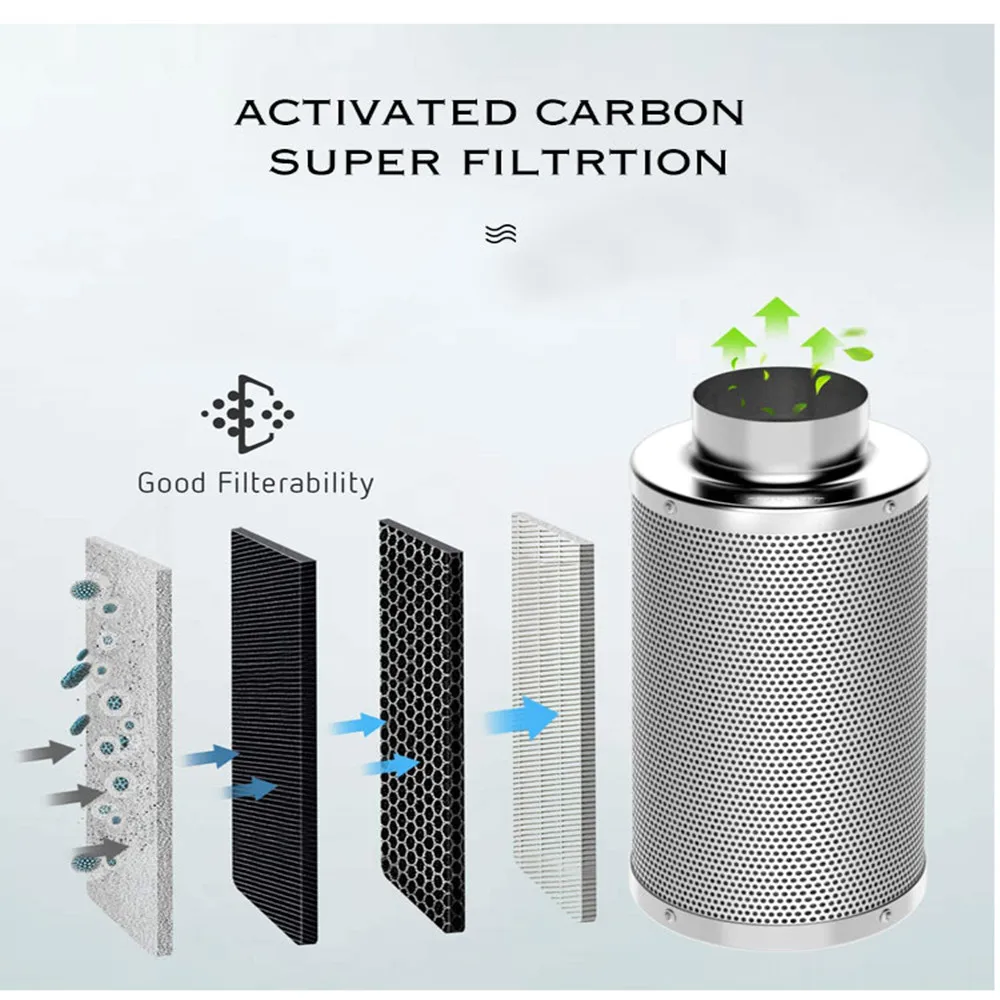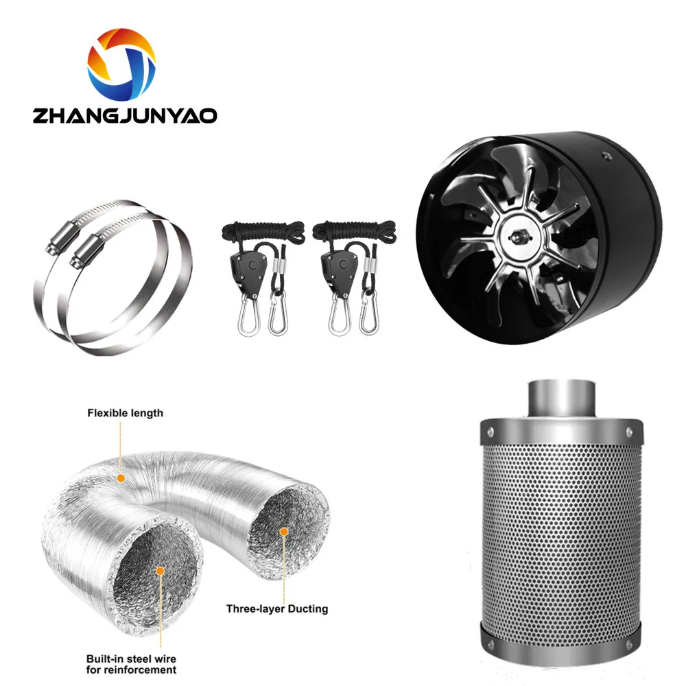 -Канальный вентилятор для теплицы Гидропоника X 1-Высокоэффективный активированный Угольный воздушный фильтр X 1-Выхлопная труба X 1-Регулируемая Тяжелая веревочная трещотка DutyPulley X 2-Хомуты для шлангов х 2