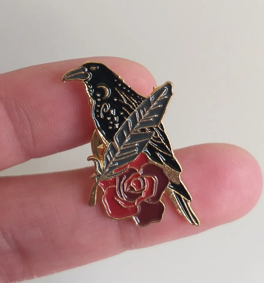Значки GDHY с эмалью, с изображением ворона, розы, Луны, звезд, меш...