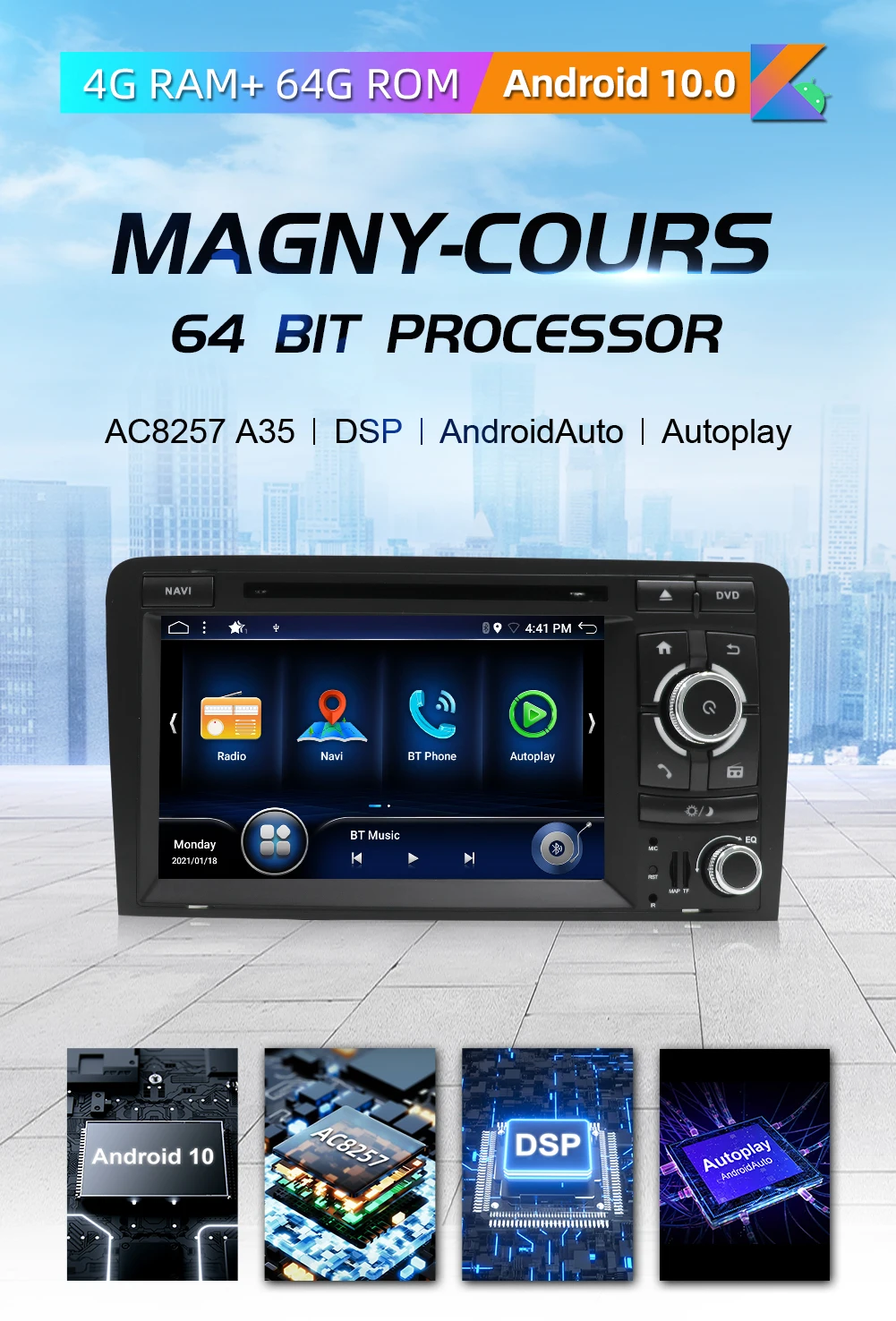 ● Android 10● ОЗУ 4 Гб, ПЗУ 64 ГБ● Мощный Процессор: AC8257 Octa core, A53, 2,5 ГГц, 64Bit процессор● DSP = Система цифрового усилителя. DSP делает качество звука автомобиля лучше, чем раньше.● Встроенный в autoplay & andrpoid auto, позволит вам подключить мобильный телефон к вашей системе транспортного средства, сделать голосовые звонки, отправить сообщение...● Поддержка панорамной функции 360 градусов, (для поддержки 4 камеры AHD)● BT5.0 может поддерживать подключение к точке доступа телефона, вы можете использовать интернет напрямую, и скорость быстрее● Встроенная gps-навигация: мы отправляем бесплатное программное обеспечение карты, пользователи могут использовать его напрямую, или вы можете приобрести в play store для автономной навигации● Камера заднего вида: Бесплатная камера в подарок, автомобиль подключен к обратной передаче для автоматического переключения● Поддержка нескольких языков: около 71 видов языков● Поддержка установки обоев● Поддержка настройки логотипа● Поддержка сабвуфера/RCA● Поддержка разделенного экрана● 2 вида уникального дизайна пользовательского интерфейса● DVR: Вы можете добавить видеорегистратор, и автомобиль имеет воспроизведение, доказательства могут быть сохранены (это опционально)● Поддержка функции OBD2/ TPMS/ DAB +/ DVB-T, но эти аксессуары являются дополнительными, необходимо дополнительно купить
