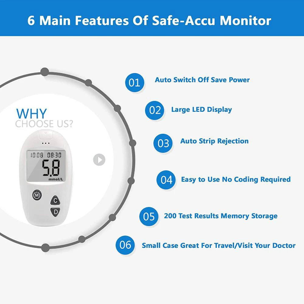 Высокая производительность: доступная, низкая цена, полнофункциональная, подходит для долгосрочного использования.Точный и простой в использовании: отсутствует кодированный тест-полосок, всего 10s время тестирования, 0,6 микро литров объем образца крови. Тест-полоски имеют передовые технологии и стабильность.Удобно: Этот продукт имеет преимущества изысканного и легкого. Легко носить с собой в любом месте. Позволяет легко проверить уровень сахара в крови во время деловой поездки или путешествия.Безопасный глюкометр Accu для определения уровня глюкозы в крови диабетик с тест-полосками и ланцетами иглы глюкометр для определения уровня сахара в крови mmol/L или mg/dl.