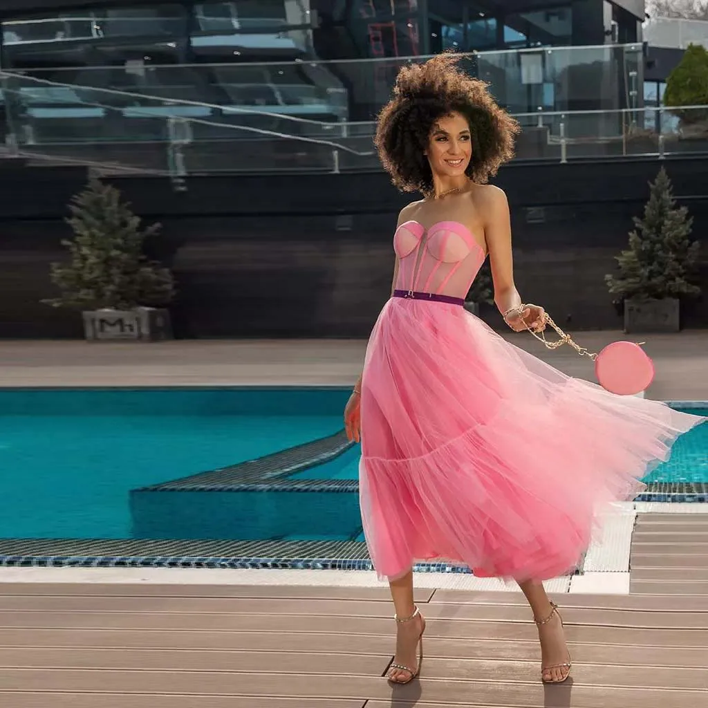 Женское бальное платье без бретелек, розовое привлекательное бальное платье из тюля, без рукавов, с поясом на талии, элегантное платье для выпускного вечера