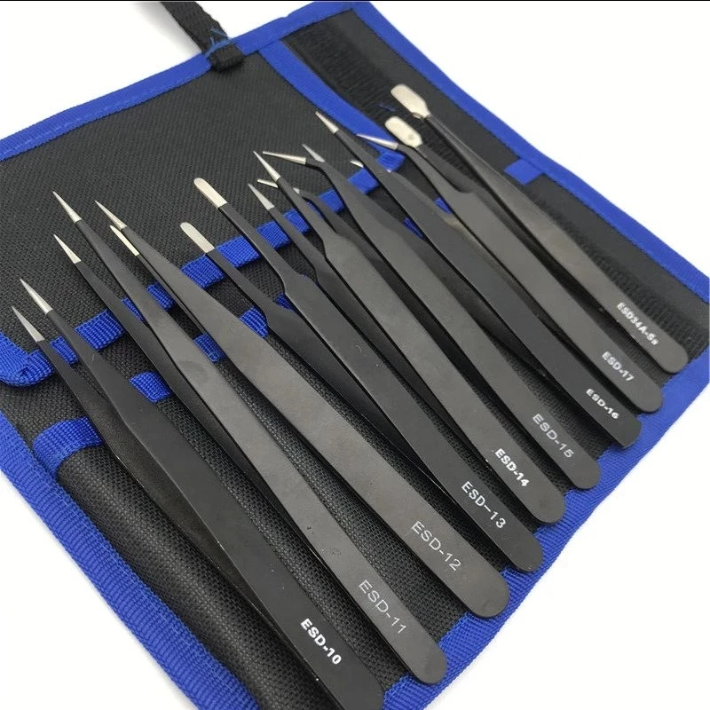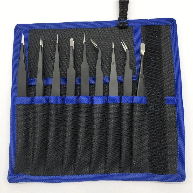 Набор антистатических пинцетов из нержавеющей стали, комплект из 9 предметов, без магнитных наконечников для ремонта электроники, пайки, ремесла, ювелирных изделий