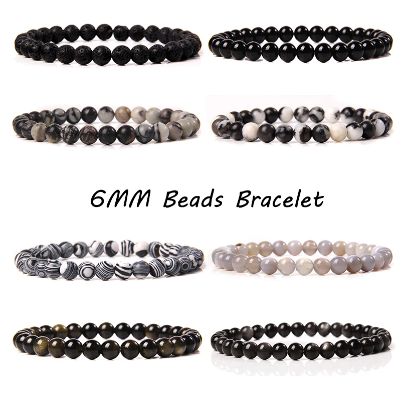 Браслеты с бусинами 6 мм для женщин и мужчин, черные, белые, серые, из натурального камня обсидиана, гематита, лава, минималистские торжественные крутые официальные украшения