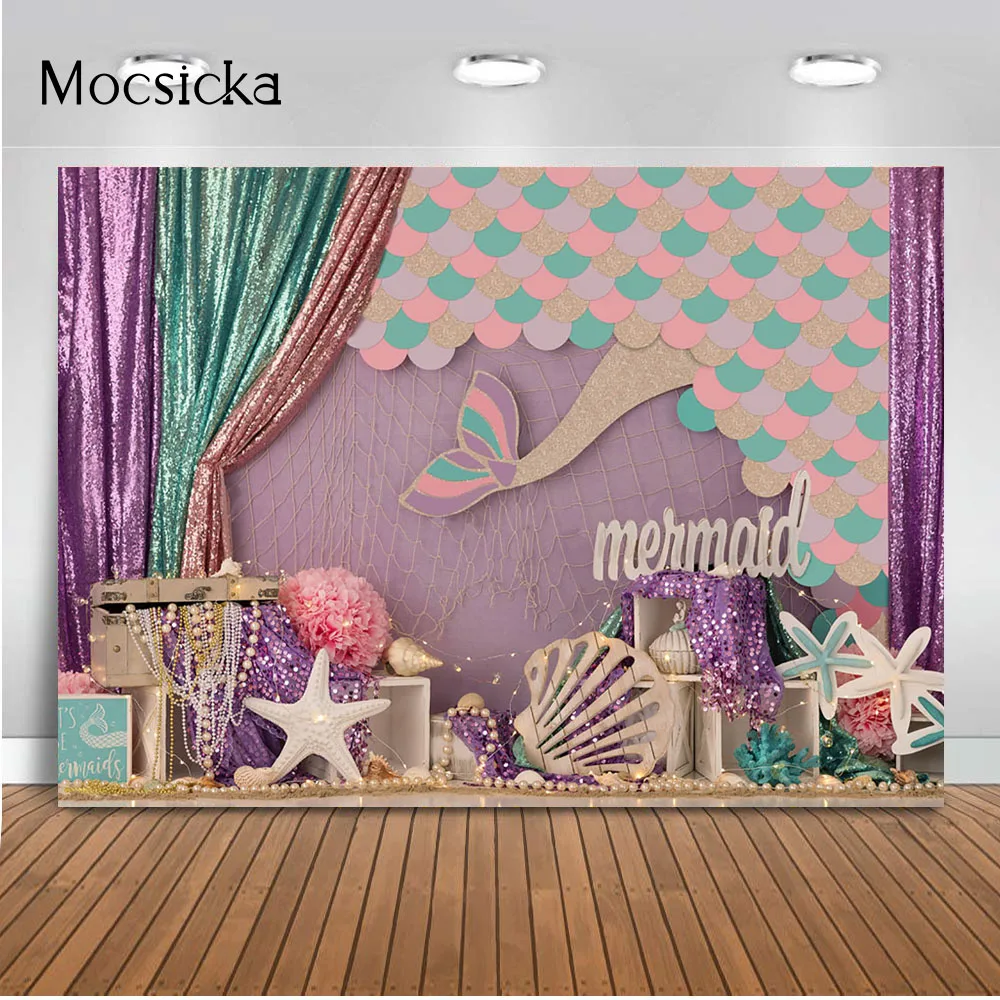 Фон для фотостудии с изображением фиолетовой русалки и торта для новорожденных девочек