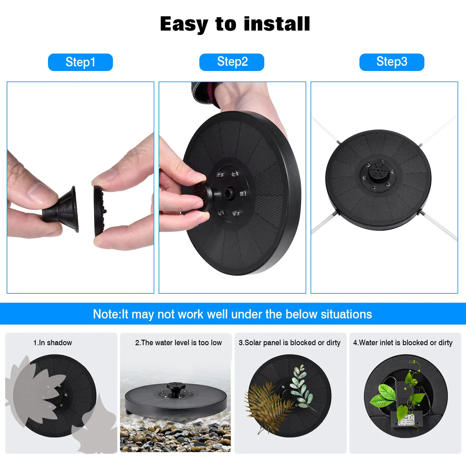Особенности:1. Хранение электричества, длительное время освещения: Новая обновленная версия солнечного фонтана. Когда солнце заполнено, он распыляет воду более мощно, чем любой другой фонтан на рынке. Он имеет встроенный высокопроизводительный полимерный литиевый аккумулятор с функцией хранения энергии. Воду можно распылять в пасмурные дни. Ночью СВЕТОДИОДНЫЙ светящийся распылитель воды может работать непрерывно в течение 5 часов, когда аккумулятор полностью заряжен.2. Украшение для садового бассейна: Красочный светодиодный свет с 6 светодиодный дами, когда наступает ночь, горисветильник три цвета (красный, зеленый и синий), делает ночной бассейн в саду еще шикарнее. Солнечный фонтан птичьего гнезда может автоматически работать под прямыми солнечными лучами всего за 3 секунды. Он имеет встроенный высокопроизводительный полимерный литиевый аккумулятор. Высота распыления больше 60 см независимо от облачности или солнечного света. Работает 5 часов без питания или аккумулятора.3. 7 методов распыления: с прикрепленными 7 разными типами насадок вы можете получить разную форму и высоту воды при различных режимах распыления. Простая установка, без расположения проводов, без вилок и дополнительных требований соответственно. Работает на солнечной энергии, не требует батарей или электричества, работает автоматически под солнечным светом, высокая эффективность, экологичность.4. Новая модернизированная технология: фонтан для хранения солнечной энергии-это Ландшафтный фонтан, в котором используются солнечные панели для зарядки аккумулятора и перекачки воды. В этом продукте используются высокоэффективные солнечные панели и новый тип бесщеточного водяного насоса, который имеет преимущества быстрого запуска, высокой эффективности и высокой стабильности. Он продолжит предлагать водный цветок для вашего сада и патио. Просто очистка и уход.5. Конструкция стержня для предотвращения столкновений: изделие оснащено четырьмя стержнями для предотвращения столкновений, который может использоваться для фиксации положения Фонтана и предотвращения дуновения фонтана к краю бассейна и перелива воды.6. Настройте функцию защиты от нехватки воды (контроль уровня воды): встроенная функция контроля уровня воды, она может автоматически перестать работать, когда есть нехватка воды, И начать сразу после добавления воды без перезапуска и активации. Простое управление предотвращает использование водяного насоса на холостом ходу и сокращает срок службы водяного насоса.7. Новый солнечный фонтан с двумя режимами работы: дневной режим, когда свет выключен, и распыление воды; Ночной режим, когда свет включен, распылить воду. Этот новый тип фонтана с солнечным насосом очень подходит для ванн для птиц, аквариумов, небольших прудов, бассейнов, садов, террас, газонов и циркуляции кислорода. Его можно использовать как фонтан для распыления воды в течение дня, а также в качестве украшения фонтана, ландшафсветильник ночью, что доставит вам больше радости.Характеристики:Напряжение солнечной панели: 7 вМощность солнечной панели: 3 ВтМаксимальный расход насоса: л/чВерхний подъем: 1,2 мМаксимальная высота распыления: 60-80 смСрок службы: ≥ 10000 часовЦвет: черныйМатериал: АБС и ПККласс водонепроницаемости: IP68Размер посылка: прибл. 17*16,5*5 см/6,69*6,50*1,97 дюймаВес посылка: 