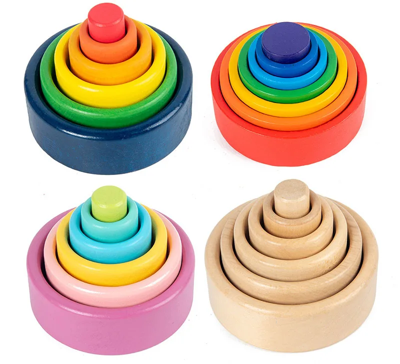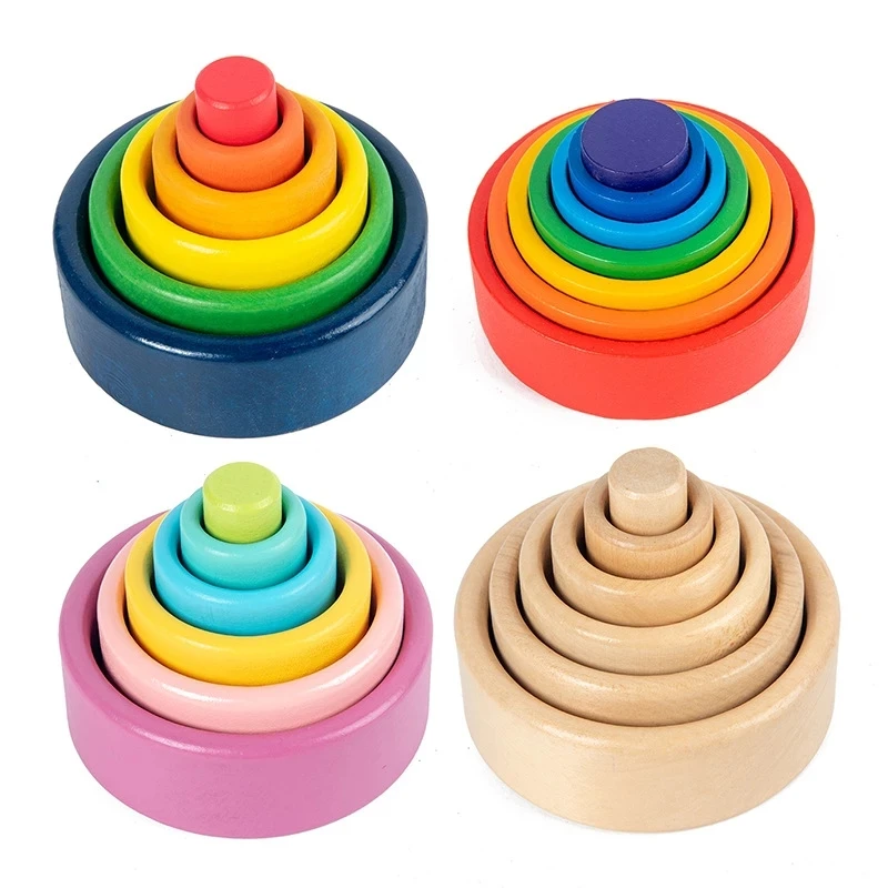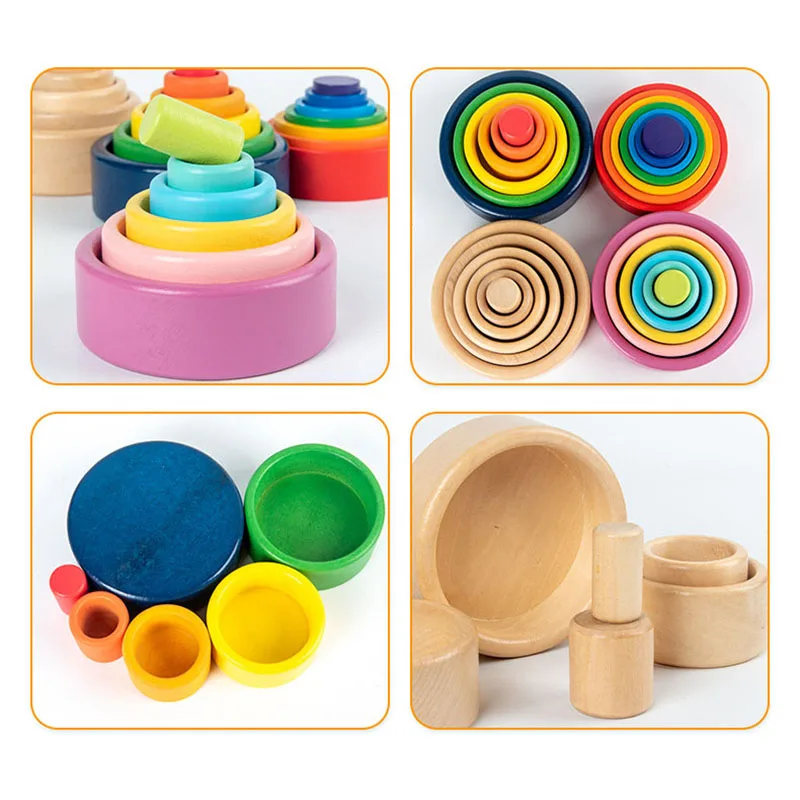 Детские деревянные игрушки, радужные блоки, чаши-гнездаЦветные некрашенные, натуральные деревянные штабелируемые чаши, детская развивающая игрушка Монтессори, подарок