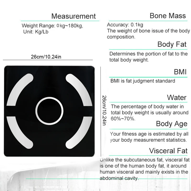 Весы для ванной можно подключить к весам Bluetooth со светодиодным интеллектуальным цифровым анализатором жира, который может отслеживать 13 видов данных о здоровье тела, а диапазон взвешивания составляет 0-180 кг.