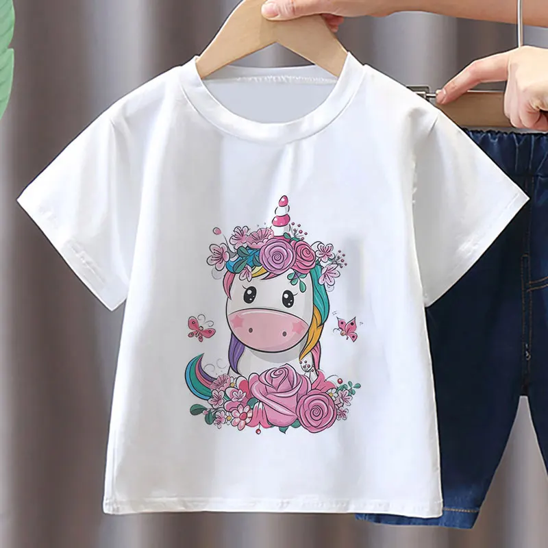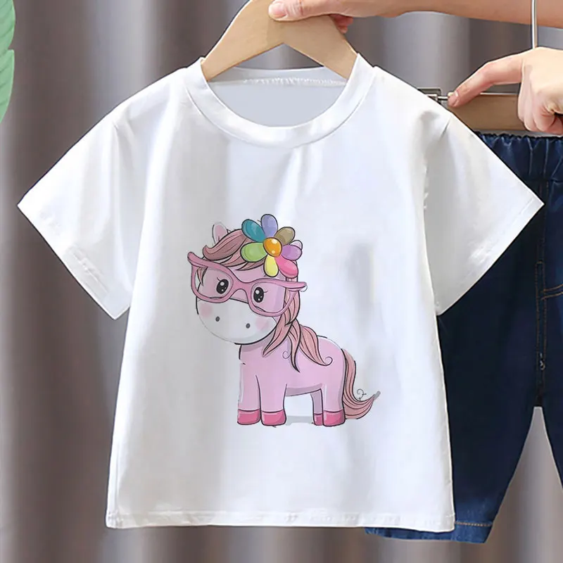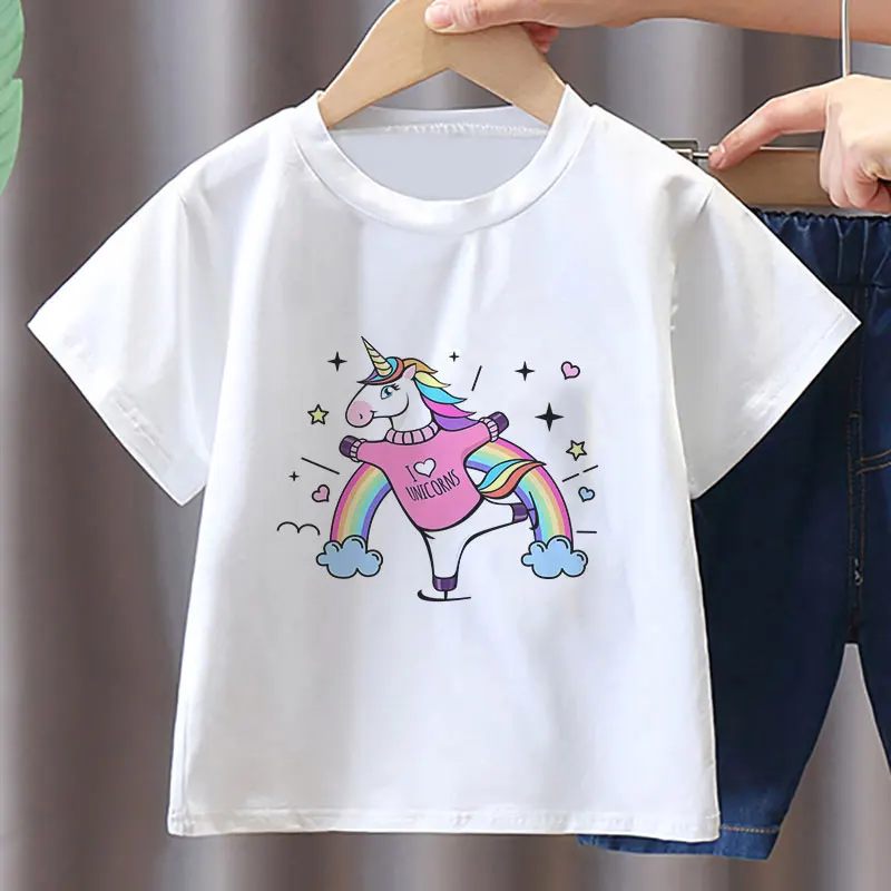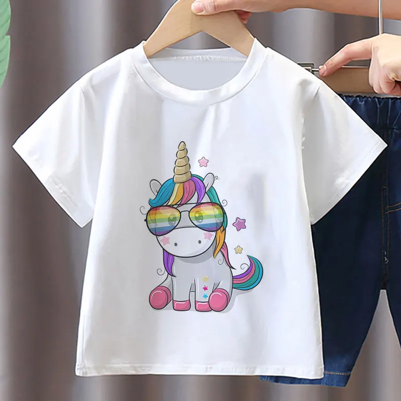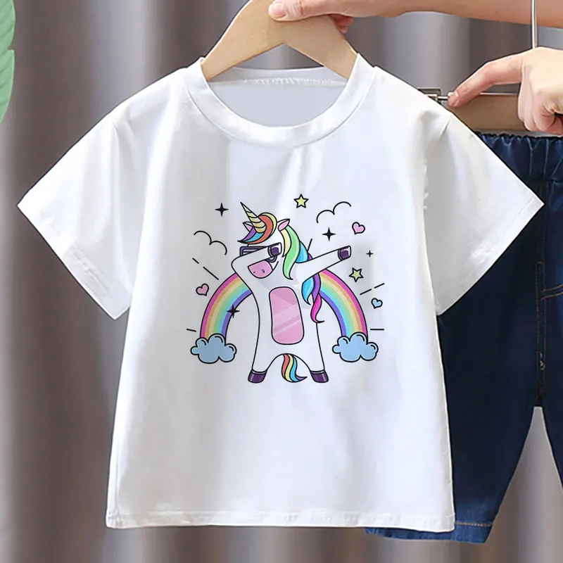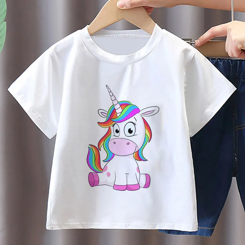 Детская одежда модный и интересные единорог Радуга дял девочек лошадь футболка для маленьких мальчиков с принтом из мультфильмов, с круглым вырезом, новая детская От 2 до 9 лет