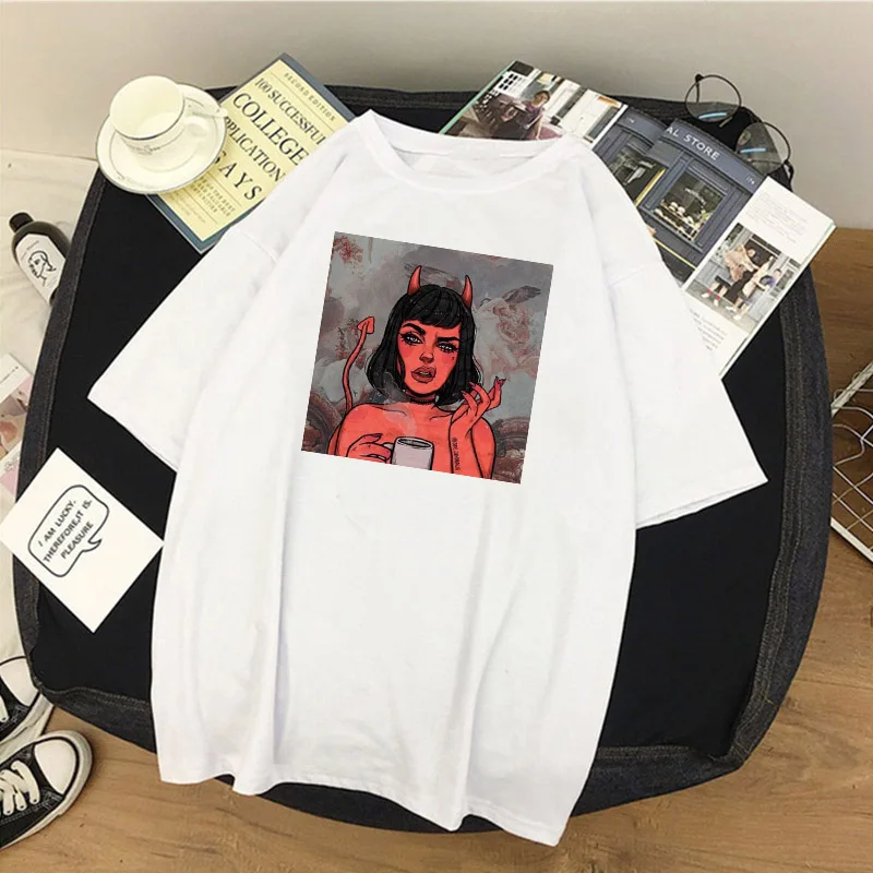 Футболка женская оверсайз с принтом "Защитите меня от дьявола", винтажная рубашка в стиле Харадзюку, топ с коротким рукавом, на лето