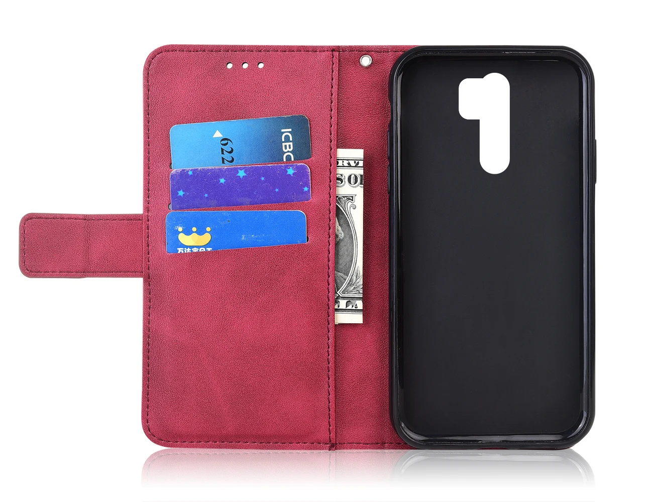 Функция: флип-подставка + сложенный кошелек + слот для карт + зажим для денег + магнитная кнопка