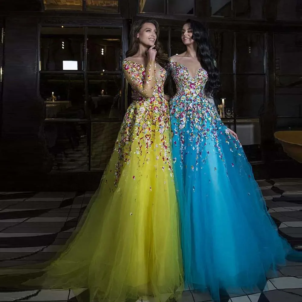 Женское вечернее платье, Тюлевое платье до пола, с глубоким V-образным вырезом, рукавами 2021, цветочной аппликацией, для выпускного вечера, Длинные бальные платья