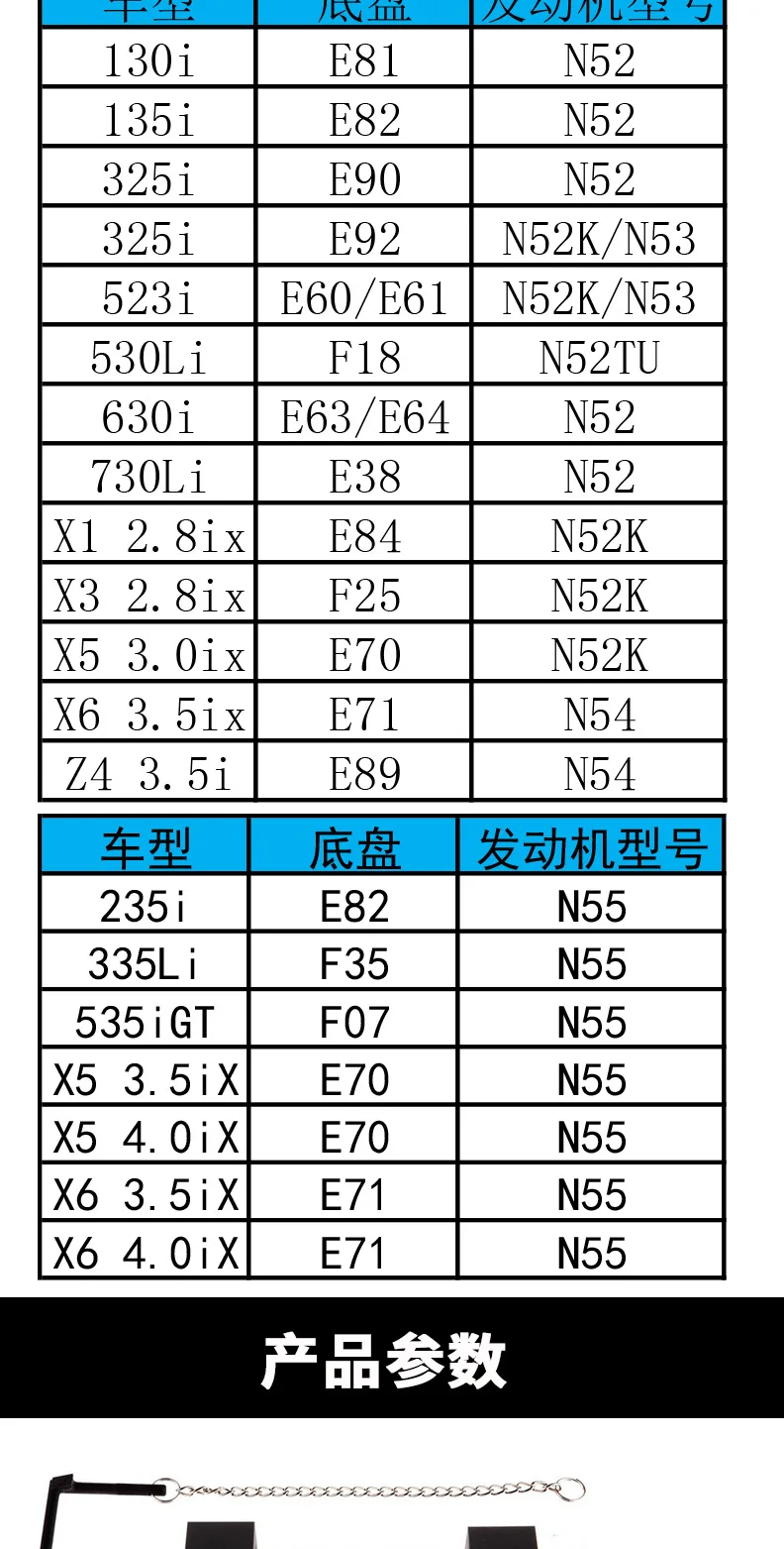 E60:523i,523Li,525i,525Li,525xi,528i,528xi,530i,530Li,530xi,535xi E61/E63: 523i,525i,525xi,530i,530xi,535xi,630i E64/E65: 630i,730i E66/E70: 730Li,X5 3.0Si E81/E82: 130i,135is E93: 325i,328i,330i,335i E83: 5I, 5I, 2.5Si,3.0i,3.0Si E85/E86: Z4 2.5i,2.5Si,3.0i,3.0Si,Z4 3.0Si E87/E90: 130i,323i,325i,325xi,328i, 328i,328xi,330i,330xi 335i,335xi E91: 323i,325i,325xi,328i,328xi,330i,330xi,335i,335xi E92: 323i,325i,325xi,328i,328xi,330i,330xi,335i, 335i