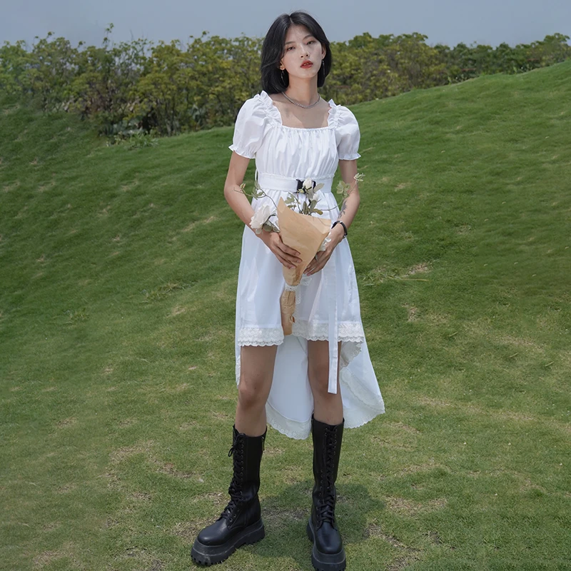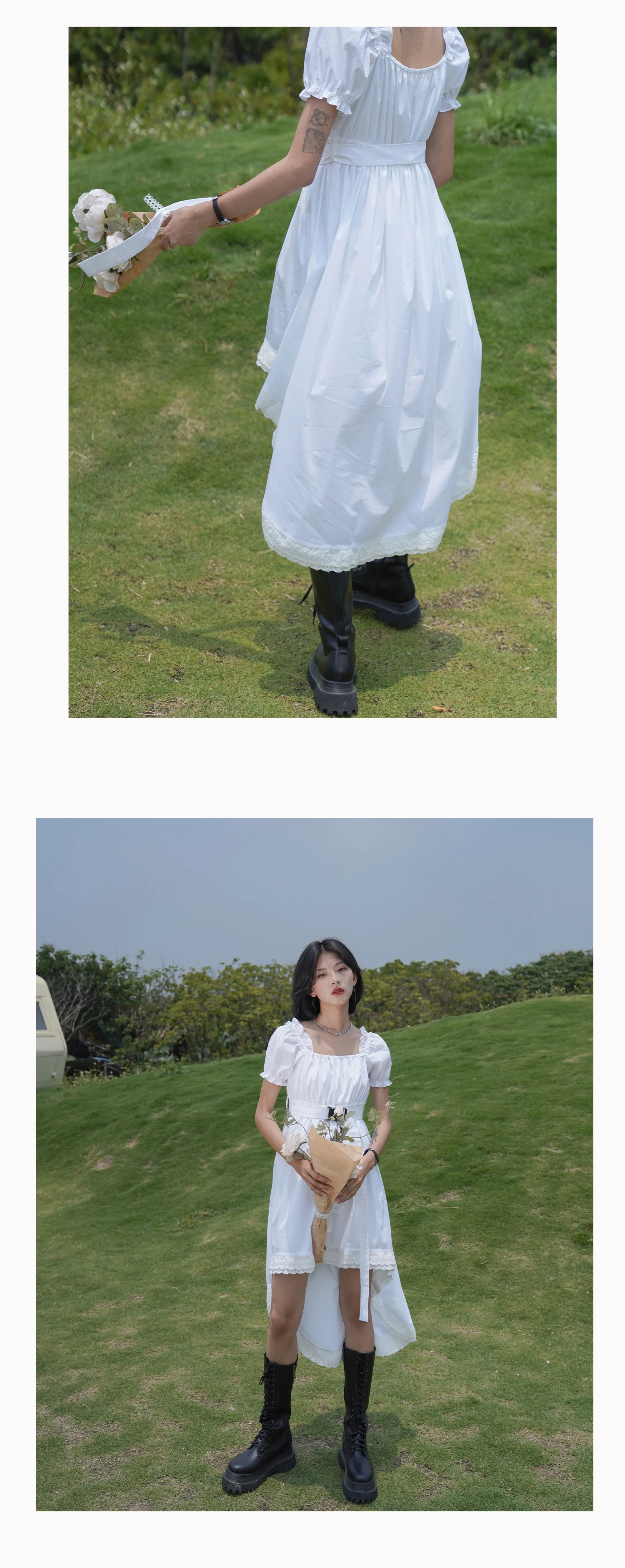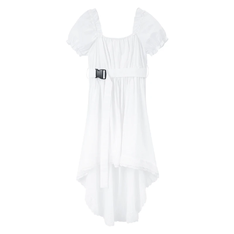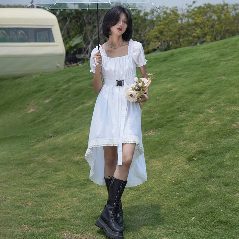 SHENGPALAE белое кружевное асимметричное платье для женщин Лето 2021 Новое платье до середины икры с квадратным воротником и коротким рукавом женское платье с поясом
