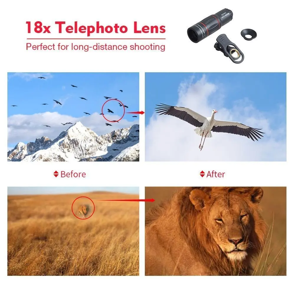 【 Объектив телескопа 18X: объектив телефото 18X приближает отдаленные предметы, используется для фотографирования предметов, к которым вы не можете приблизиться, сделайте свой телефон крупным планом и снимками большого диапазона без ущерба для качества изображения, сделайте снимок, который ваш телефон в настоящее время не может.