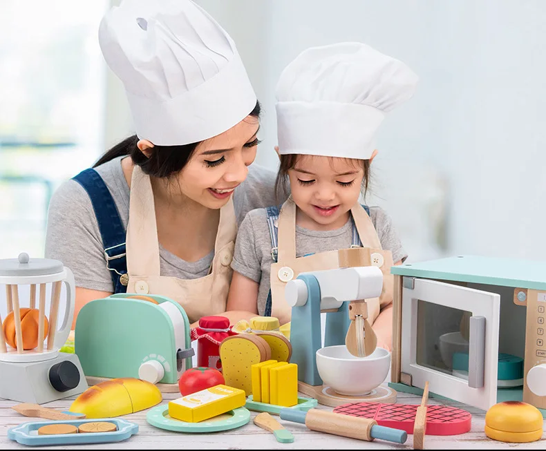Игрушечные игрушки для детей, деревянные Имитационные тостеры, хлебопечка, кофемашина, блендер, набор для выпечки, миксер, кухонные ролевые игрушки
