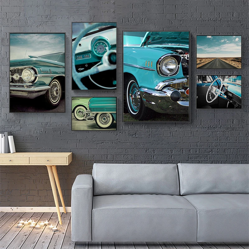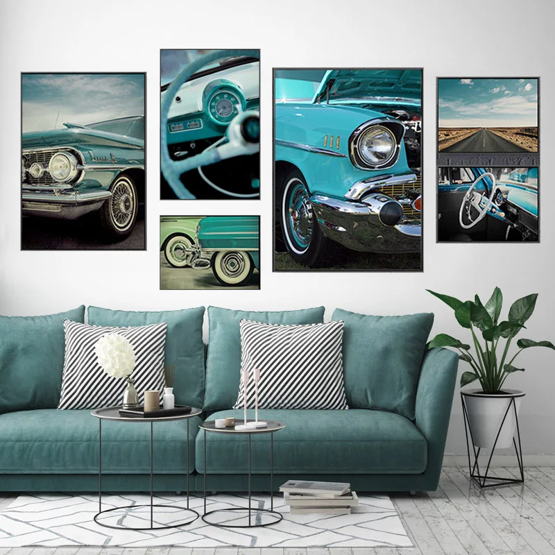 Синий плакат на холсте автомобиля, картина, Винтажный Классический автомобиль на колесах, настенные художественные принты, картина, натюрморт, украшение для дома для гостиной